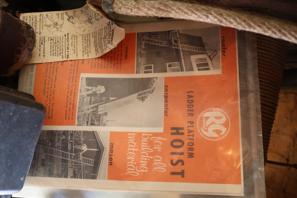 Liquidation of a general contracting company. Items include towable motor mixer; Muller power trowell steel cable rolls; live edge wood slabs/boards; Mutoh drafting machine; rolls orange plastic safety fencing; Skil 1/2" drill model 351 drill press; primed cedar siding; C. B. Nelson Co. "Cost Cutter" saw table; concrete chutes; steel scaffold wall brackets; two-wheeled material dollies; concrete curing blankets; ladder jacks; Universal portable propane convection heater; wood frame storage shed; Miller Ready Roofer fall protection kit; PVC sewer/drain fittings; dimensional lumbar boards; scaffold screw jacks; Karnak roofing/foundation coatings & much more. Items are located in Pawling, NY.