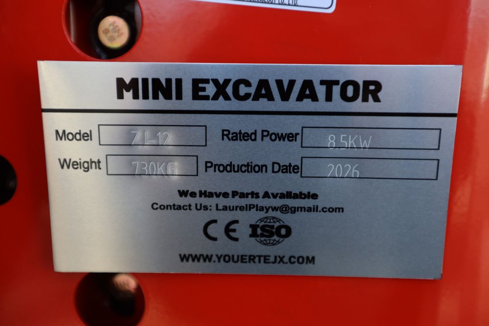 New 2026 ZJG Mini Excavator, model: ZJZ-12 with canopy, dozer blade, bucket, and gas engine. Hours reading less than 1 hour.