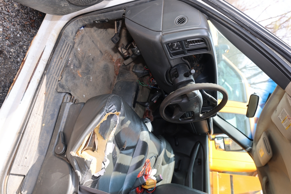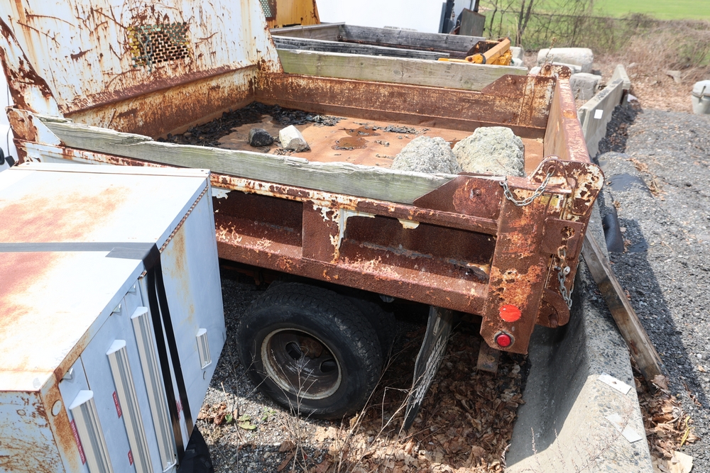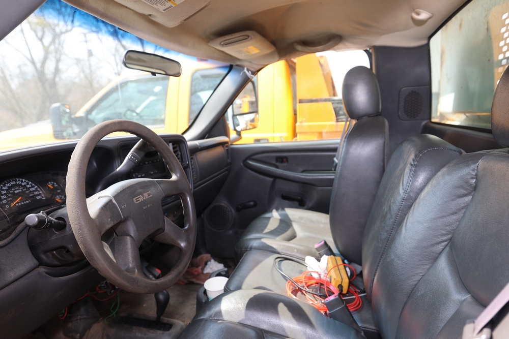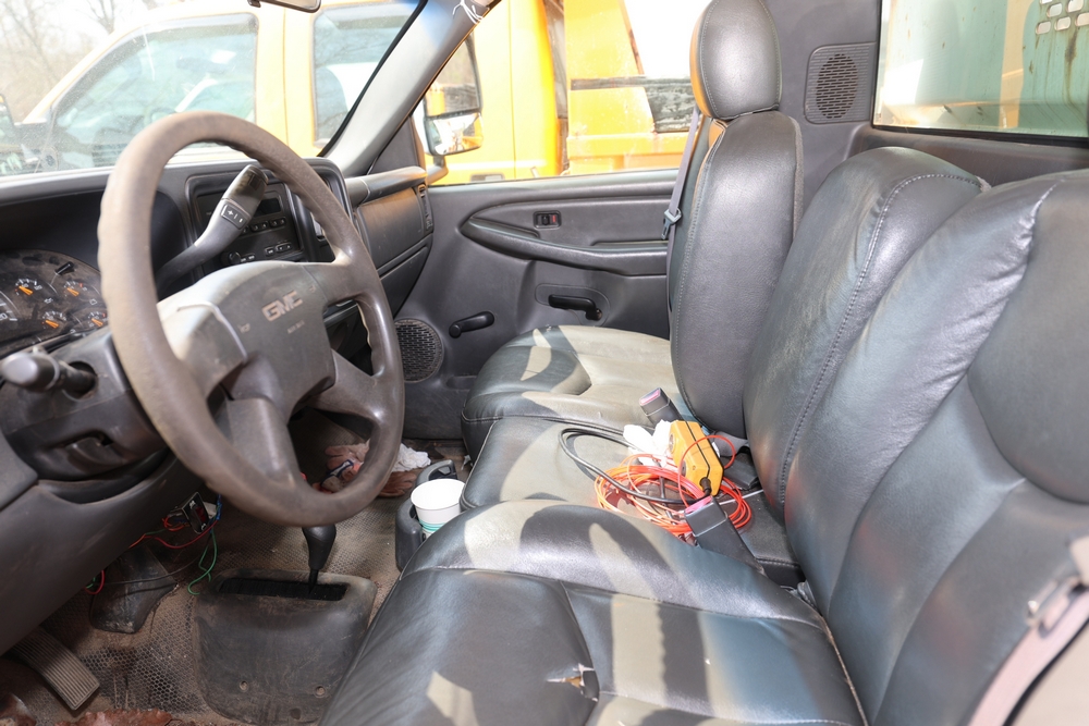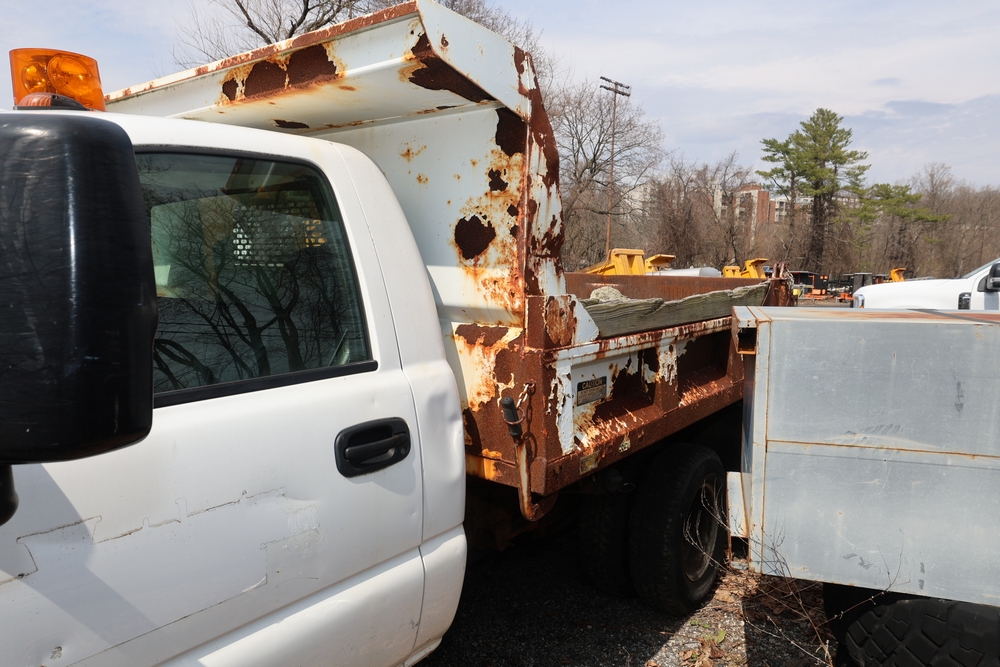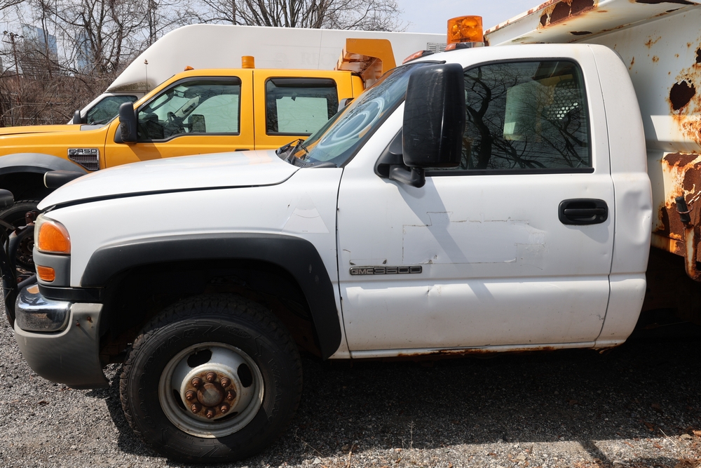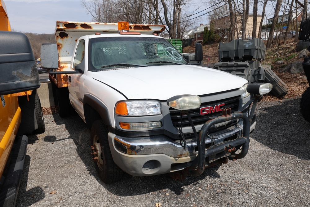 2006 GMC Dump Truck. VIN: 1GDJK34D66E169265. Odometer reading: 53220. Seller reports: Chassis and dump body in poor codition. Needs front and rear brakes, Transfer case and pinion seals leaking. Needs front and rear shocks. Front seat torn and damaged cushion. Weak/dead 12 volt battery. Engine: 6.6L / V8. Key and Title available. Fleet #: 067642.