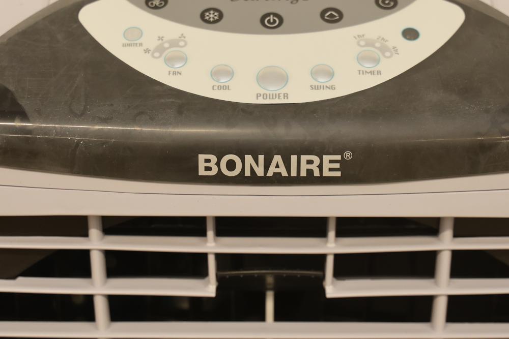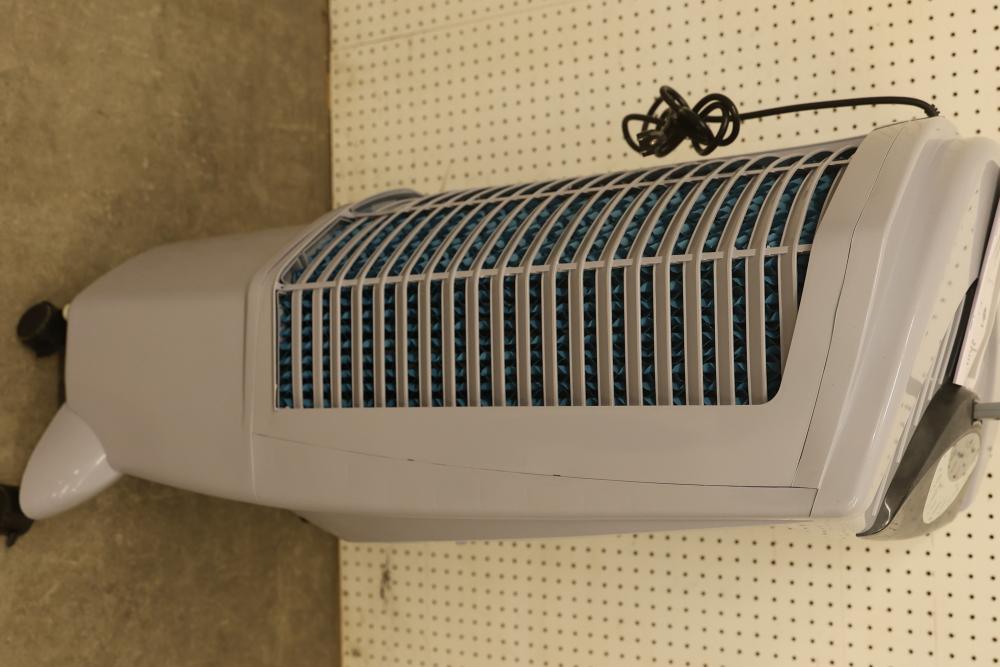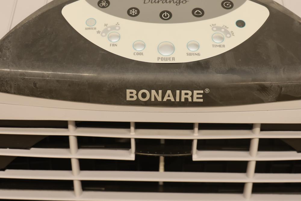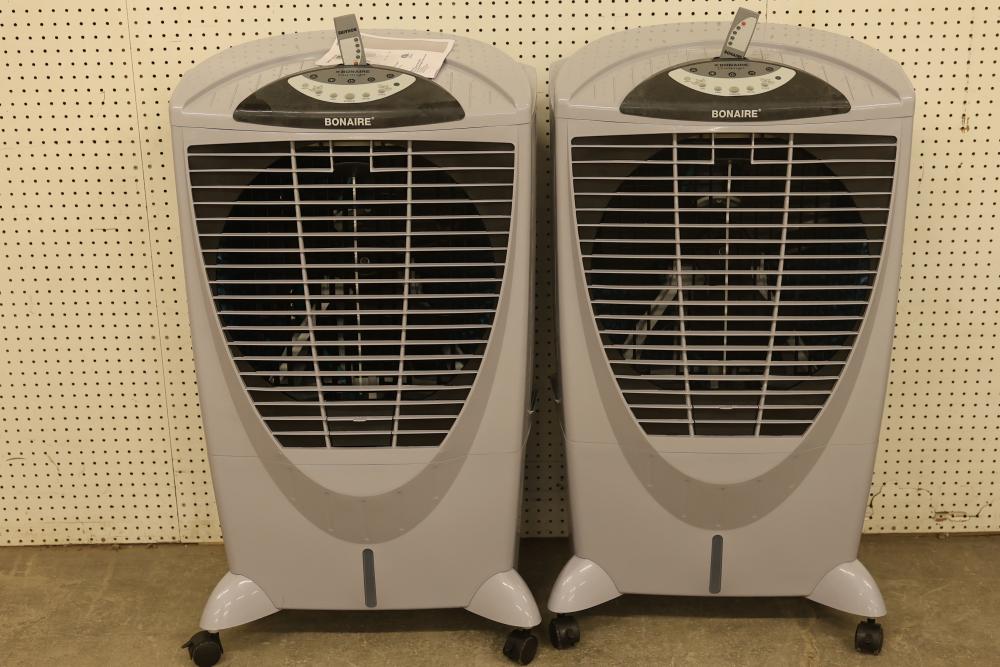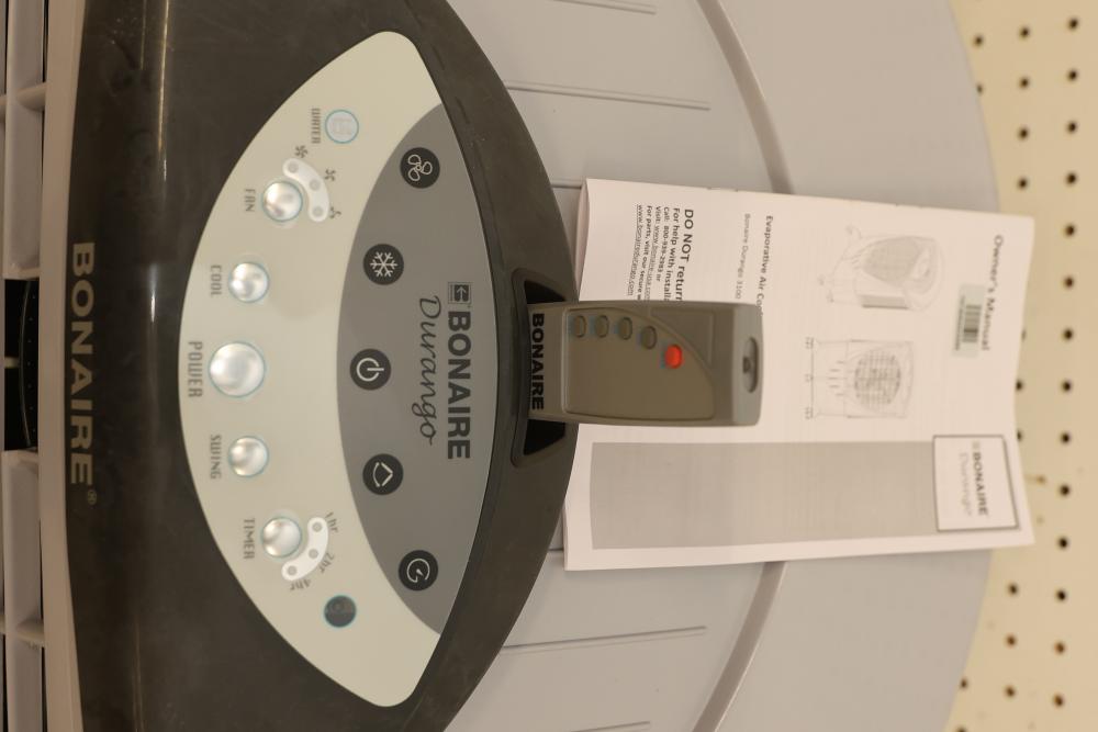 Bonaire Durango 3100 CFM Portable Evaporative Air Cooler with Remote, Model CDU6280051. Quantity of two. Features adjustable control panel, remote control, and removable filters. Instruction manual is included. Specifications: 120 V, 60 Hz, 1.9A. Pickup only.