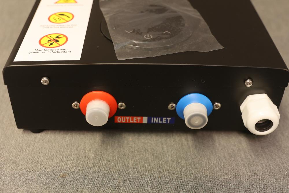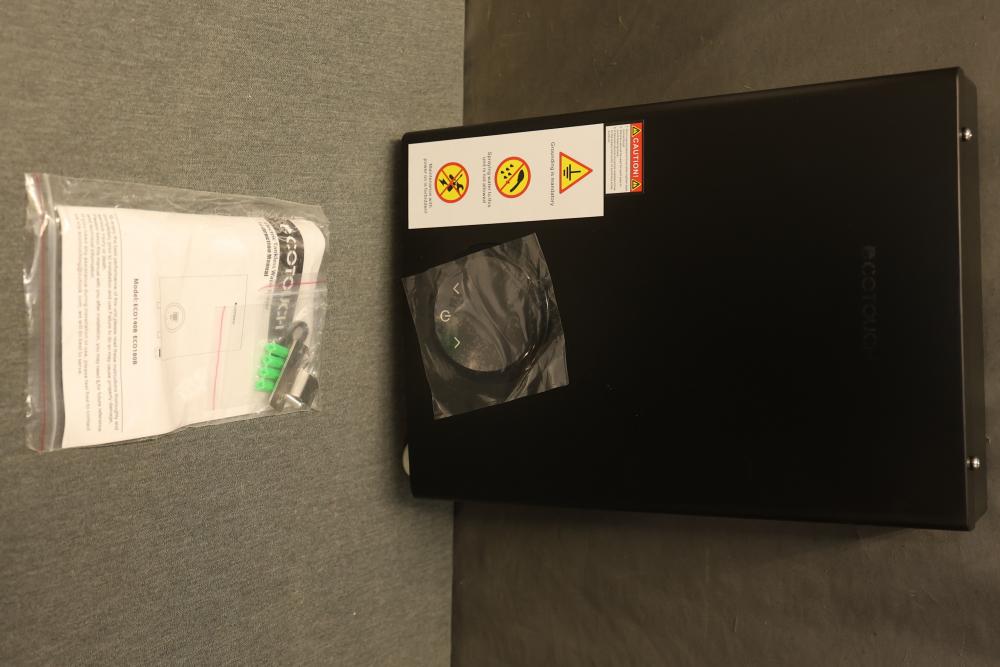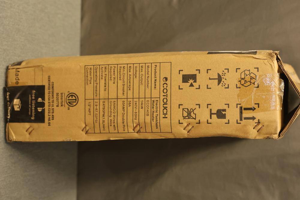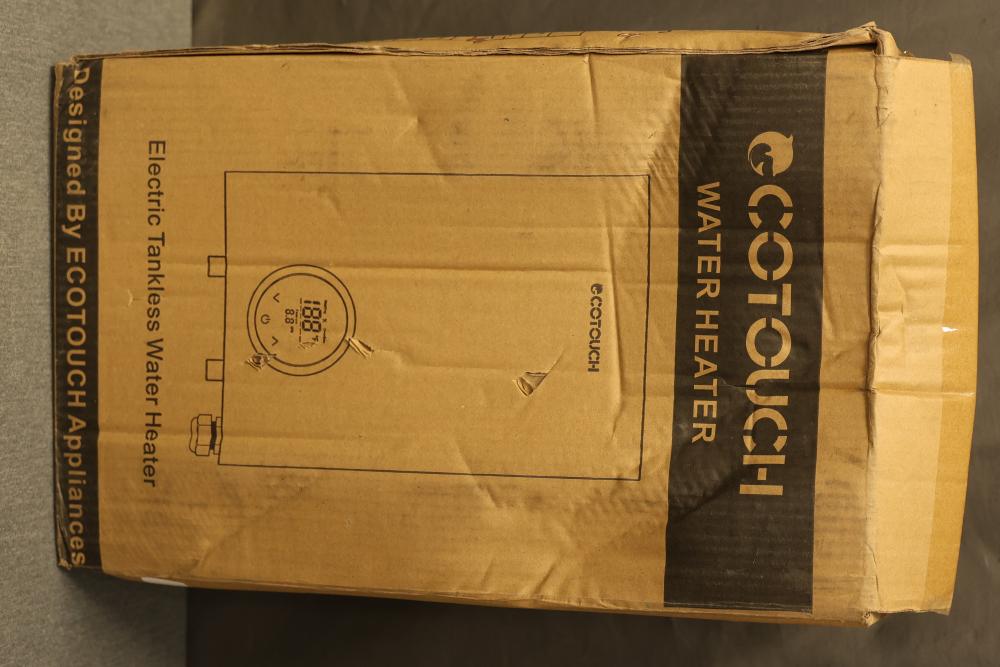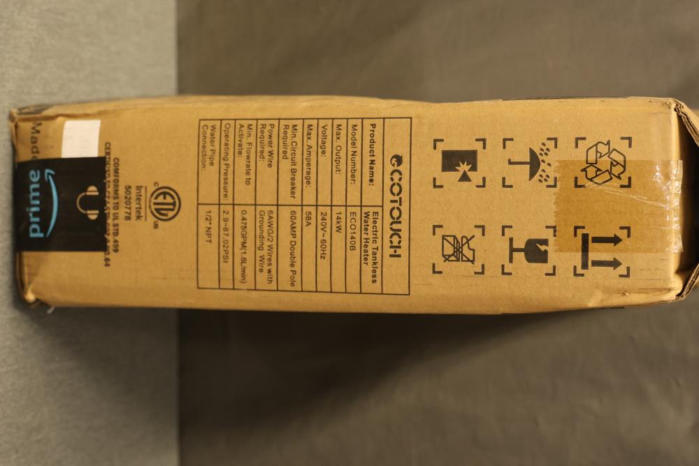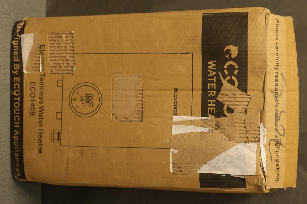 Ecotouch ECO140B Electric Tankless Water Heater, 240 V, 60 Hz, with a minimum flow rate of 0.475 GPM (1.8 liters per minute) and .5 inch NPT fitting. The unit includes its original packaging, though the box has visible wear. Accessories and an instruction manual are included.Â