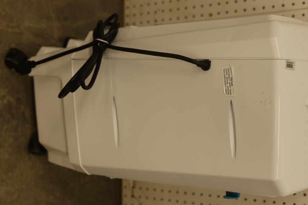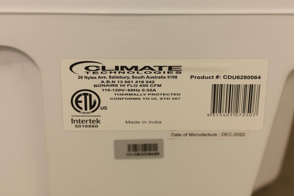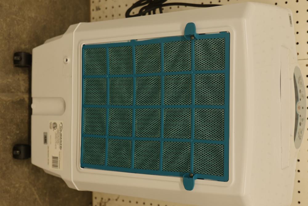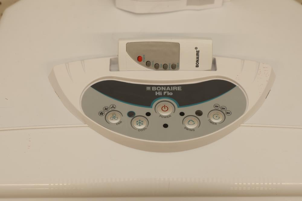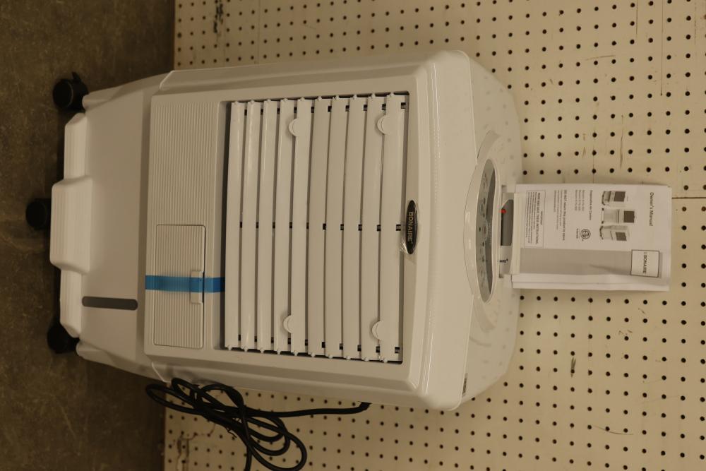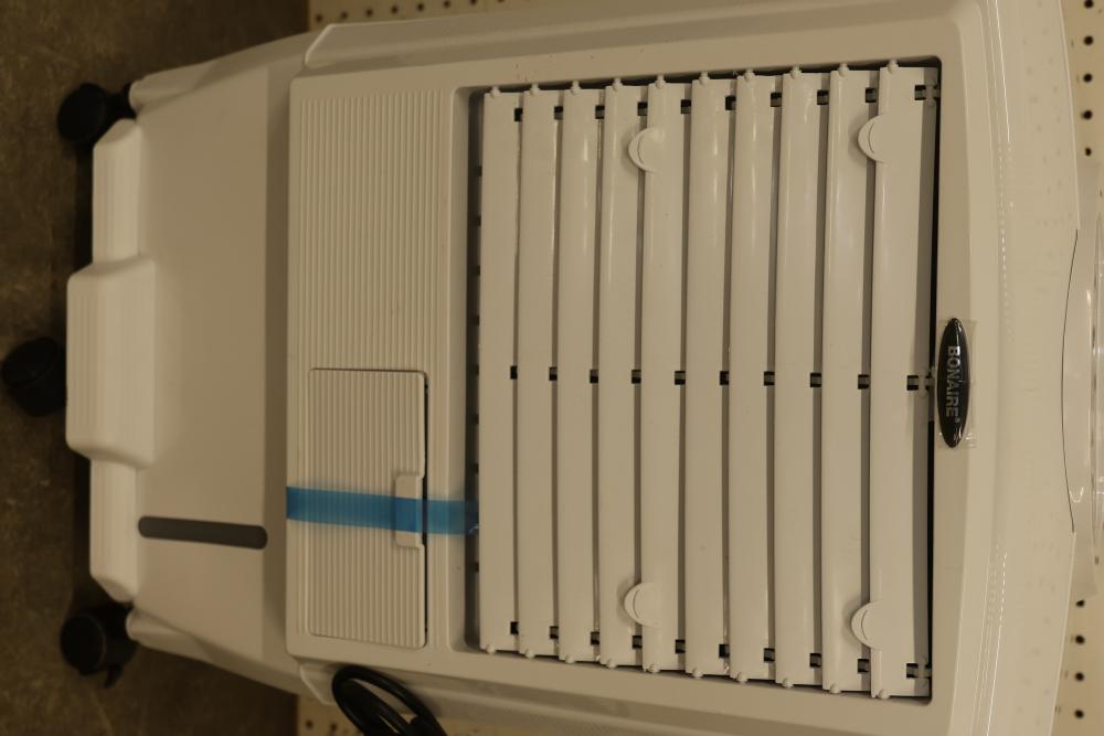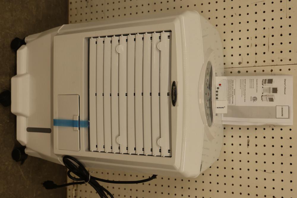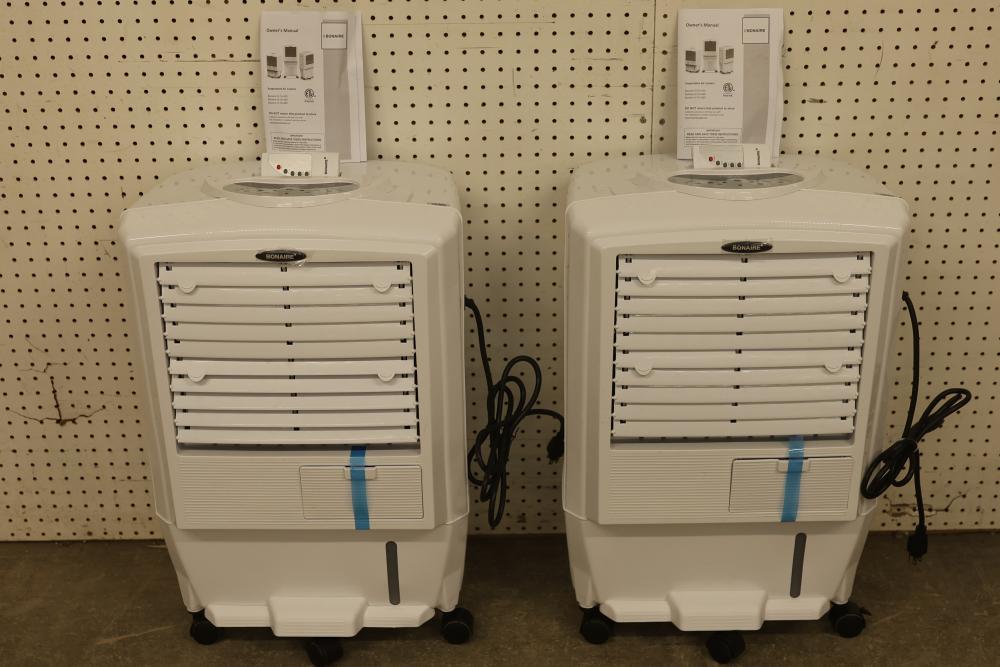 Bonaire Hi Flo 450 CFM Portable Evaporative Air Cooler with Remote, Model CDU6280064. Quantity of two. Features include an adjustable control panel, remote control, and removable filter. Instruction manuals are included. Specifications: 110-120V, 60Hz, 0.55A. Pickup only.