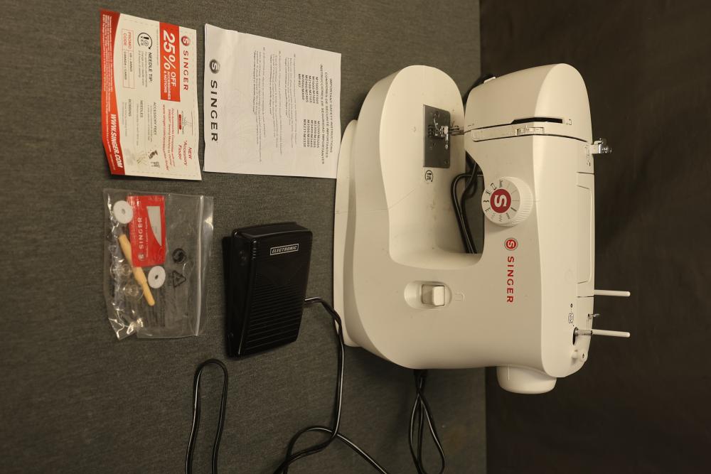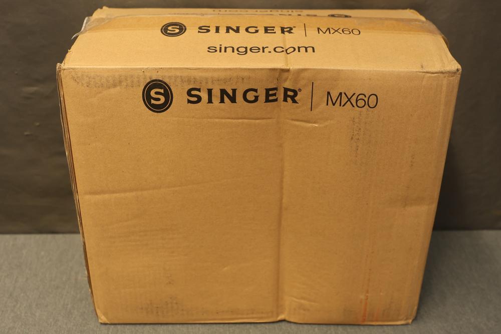 Singer MX60 Lightweight Portable Sewing Machine. Includes the sewing machine, power cord, foot pedal, manual, and small accessories. The item appears unused and comes in the original box, which shows wear from handling.