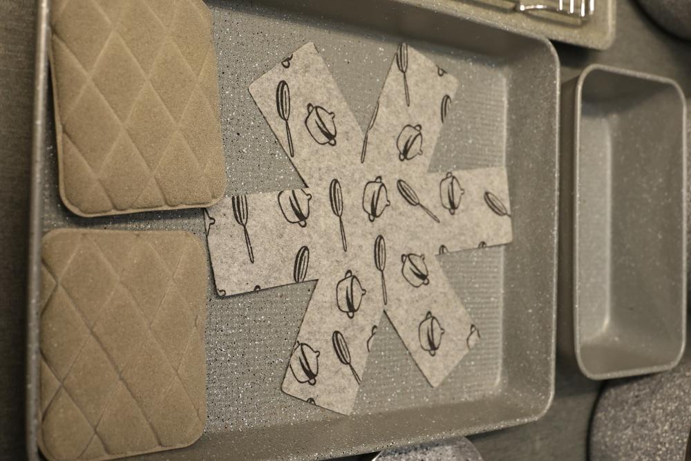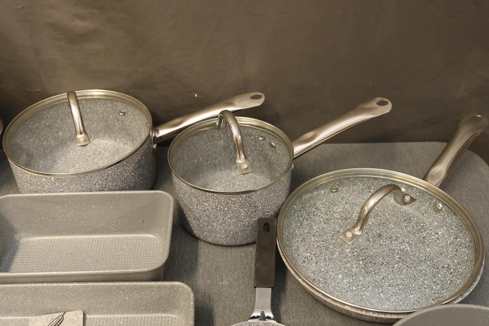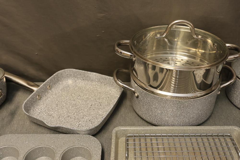 Home Hero Cookware Set With Nonstick, Oven-Safe Granite Color Pieces. Includes a baking tray, a casserole pan with a steamer, a muffin tray, pan protectors, cleaning sponges, and multiple pots and pans. The cookware is designed in granite coloring and features nonstick properties for easy cleaning. All items are oven safe. Pickup only.