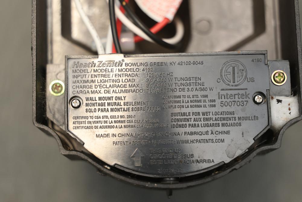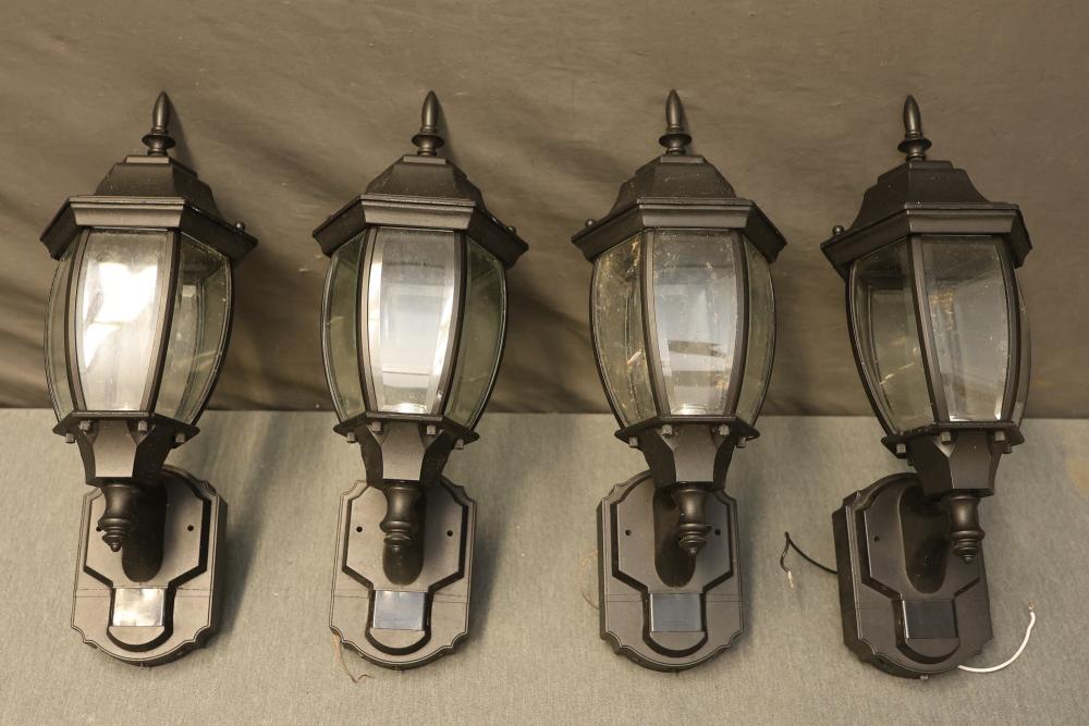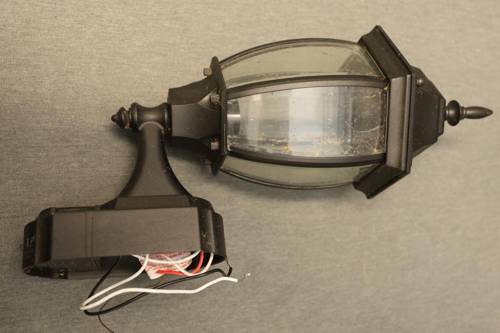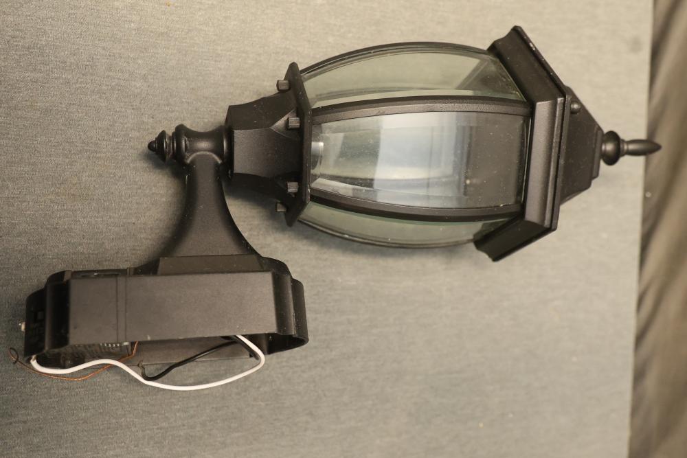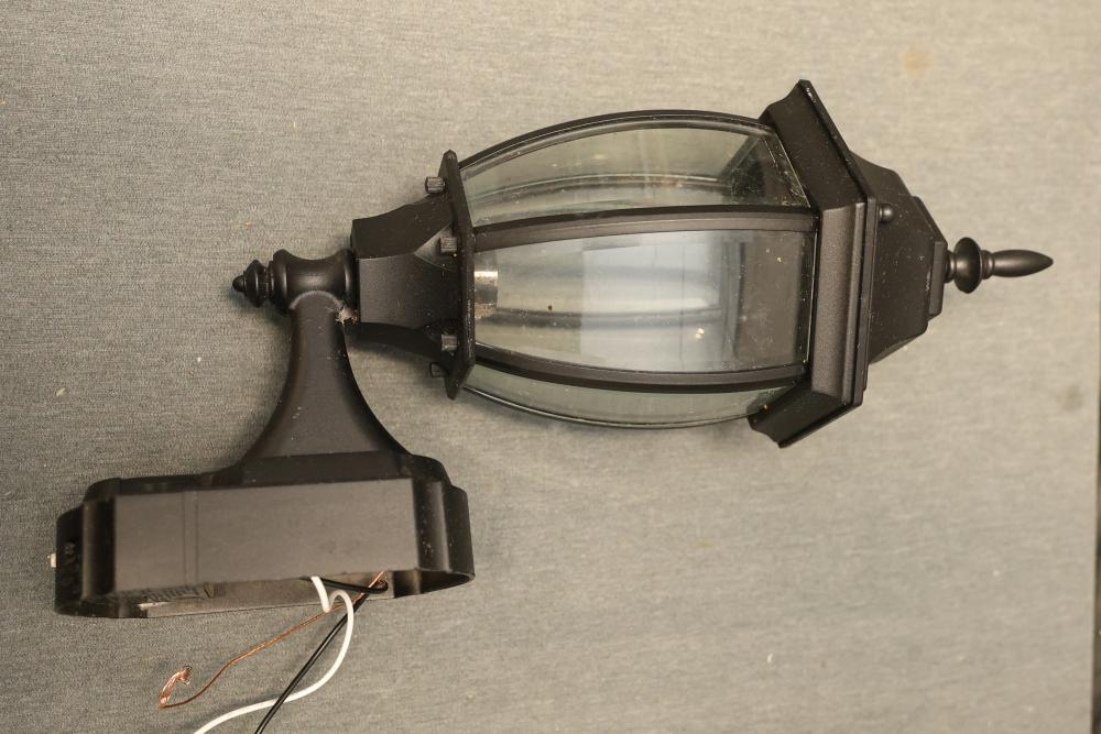 Heath Zenith HZ-4192-BK Six-Sided Die-Cast Aluminum Lantern with Beveled Glass in Black. Quantity of 4. Features die-cast aluminum construction with a black finish and beveled glass panels. All units show some signs of prior use and wiring is exposed. Pickup only.