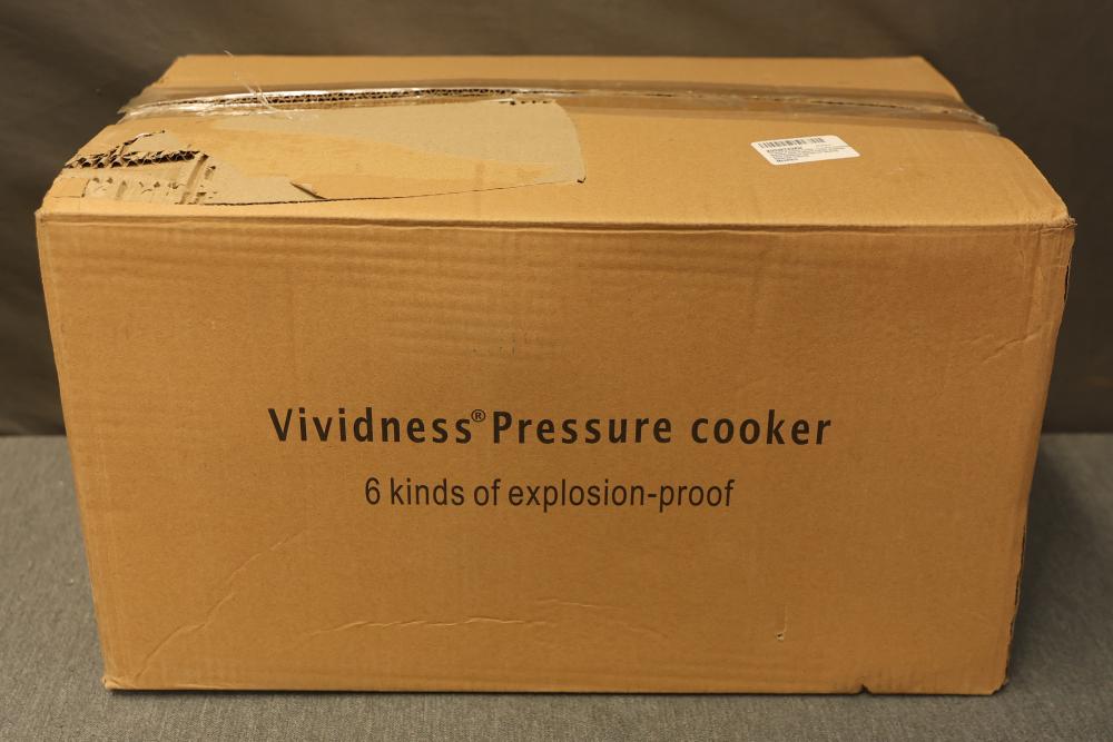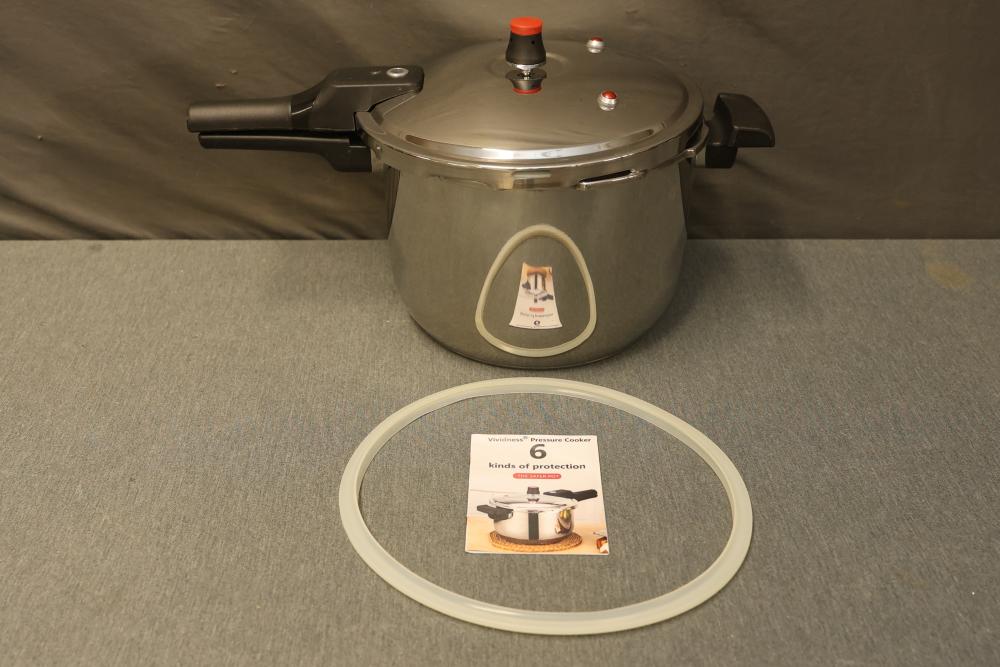 Vividness Pressure Cooker in Stainless Steel with 4 Liter Capacity. Features include a durable construction with a secure locking lid, a pressure release valve, and 6 kinds of explosion-proof safety measures. Comes with a sealing ring and user manual.