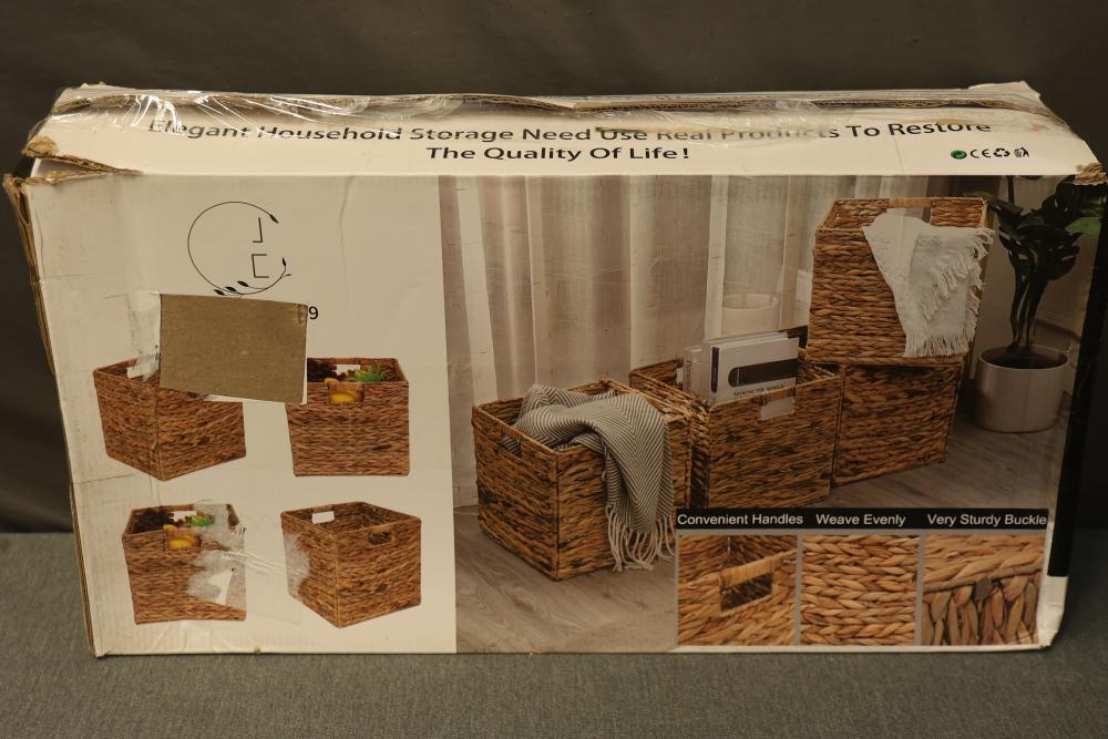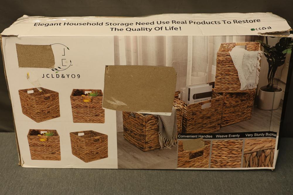 JCLD&Y09 12x12 Foldable Handwoven Wicker Cube Baskets and Wejipp Pull-Out Cabinet Organizers. This set includes four 12x12 foldable handwoven wicker cube baskets and pull-out cabinet organizers that measure 16 inches to 26 inches wide and 17.3 inches deep. Functional and versatile for storage needs.