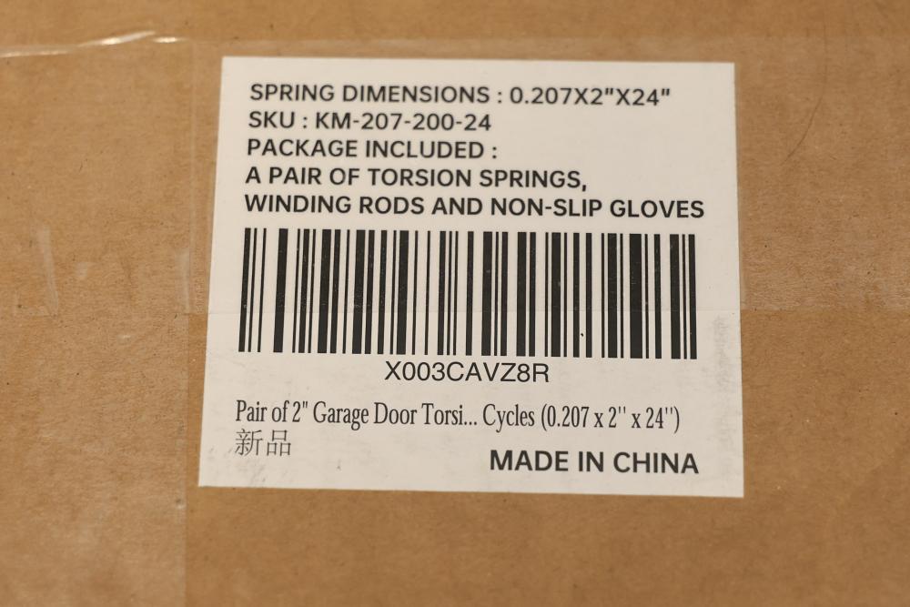 KaiMinDogz Pair of 2 inch Garage Door Torsion Springs with Winding Bars and Gloves. Springs are 24 inches long and have a wire gauge of .207. Package includes two torsion springs, winding rods, and non-slip gloves. Warning labels and safety instructions are present on the packaging for safe handling.