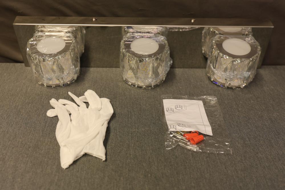 Aipsun 8271-3T 3-Light Crystal Vanity featuring a sleek design with three crystal light fixtures. Measures approximately 20.5 inches long and 4.5 inches wide. Maximum 18W, 6000K color temperature, and supports 100-265V/50-60Hz. Includes installation accessories and gloves.