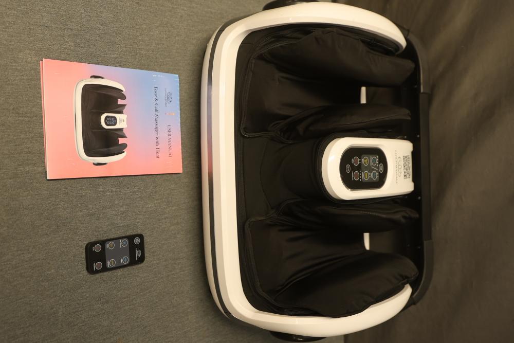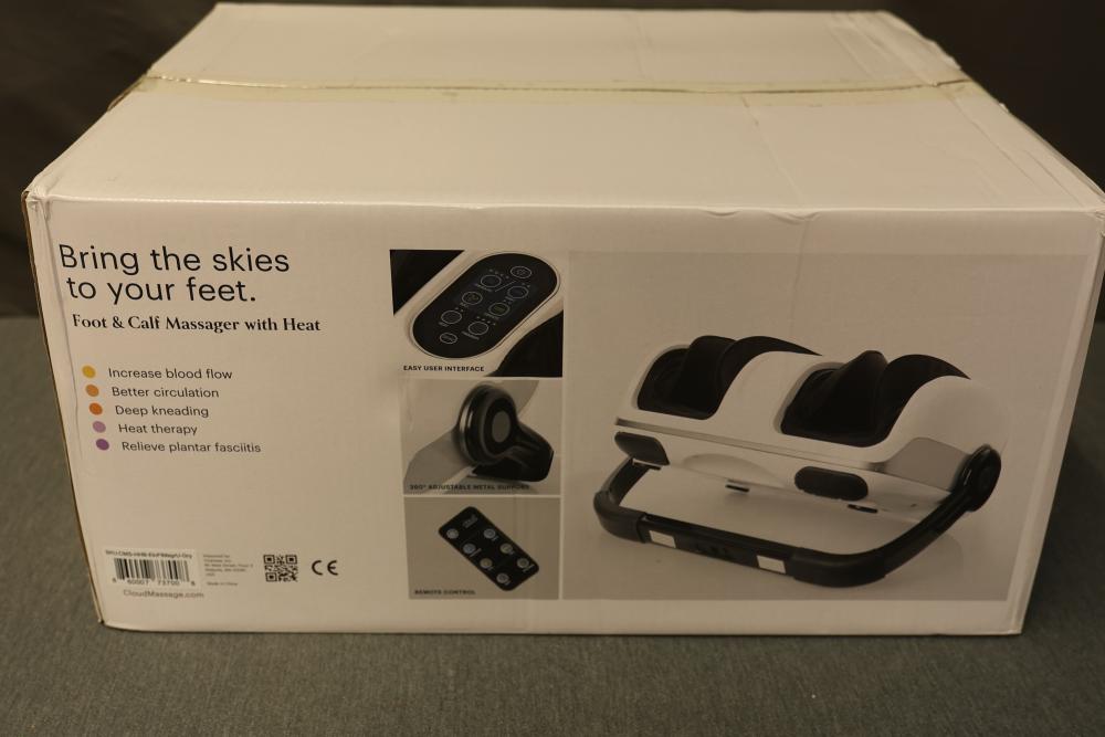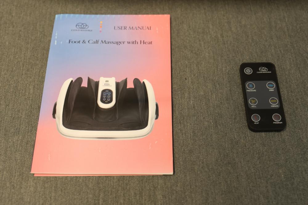 Cloud Massage Foot and Calf Massager with Heat. Includes remote and user manual. Power cord is missing.