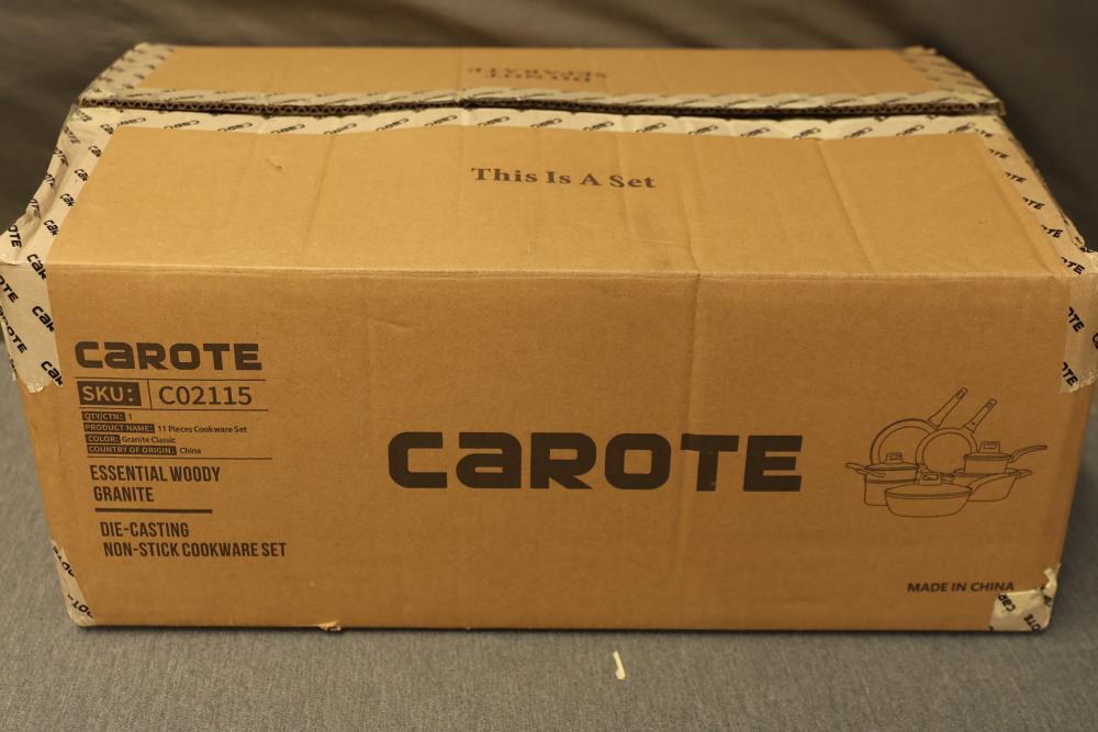 Carote CO2115 11-Piece Cookware Set and Sky Solutions Anti-Fatigue Leather Kitchen Mat in Chocolate Brown. The cookware set features die-casting, non-stick surfaces in a classic granite finish. New in packaging. Includes an anti-fatigue kitchen mat with a comfortable design in a chocolate brown color.