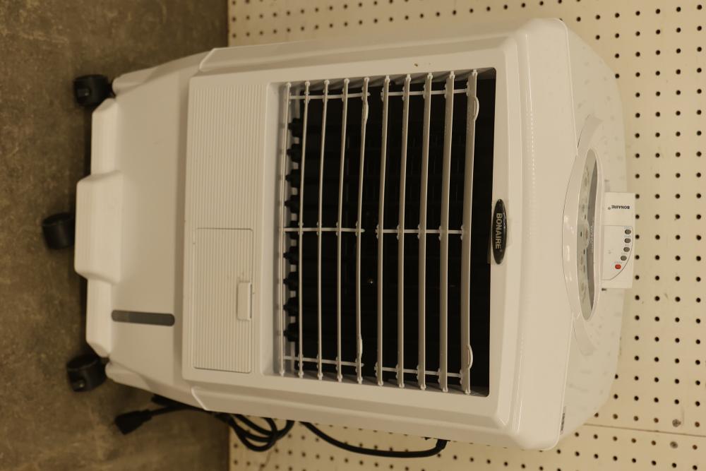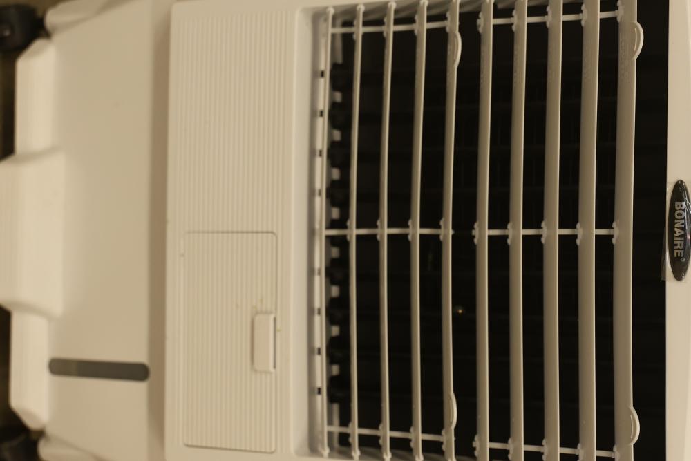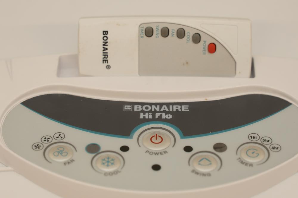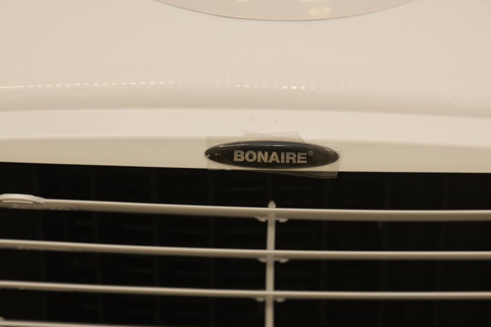 Bonaire Hi Flo 450 CFM Portable Evaporative Air Cooler with Remote, Model CDU6280064. Features adjustable control panel, a remote control, and a removable filter. 110-120 V, 60Hz, 0.55A. Includes instruction manual. Pickup only.