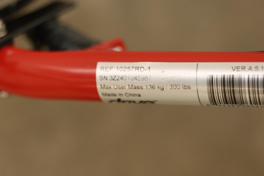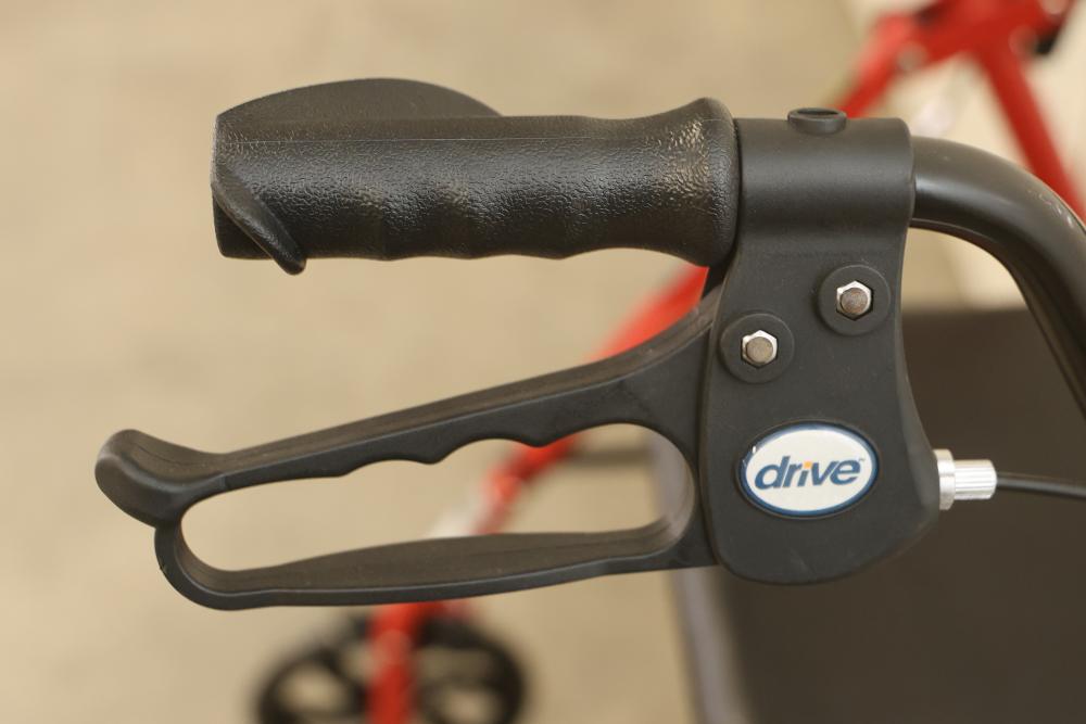 Drive 10257RD-1 Medical Rollator Walker with Seat and Underseat Storage Bag. Height adjustable, foldable, and features a durable steel frame. Finished in red, it supports up to 300 lbs. The seat measures approximately 12 inches wide, and the height ranges from approximately 31 to 35 inches. Pickup only.