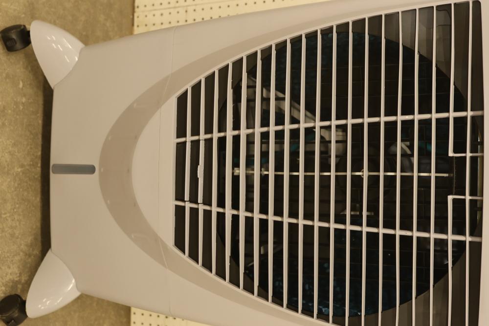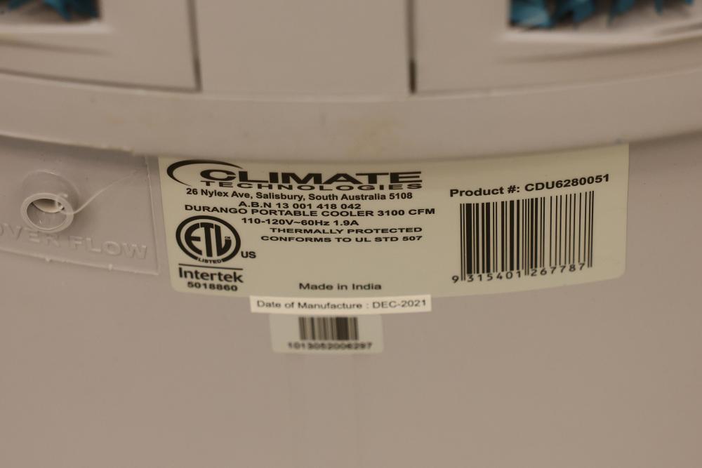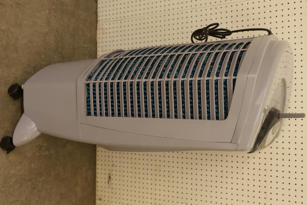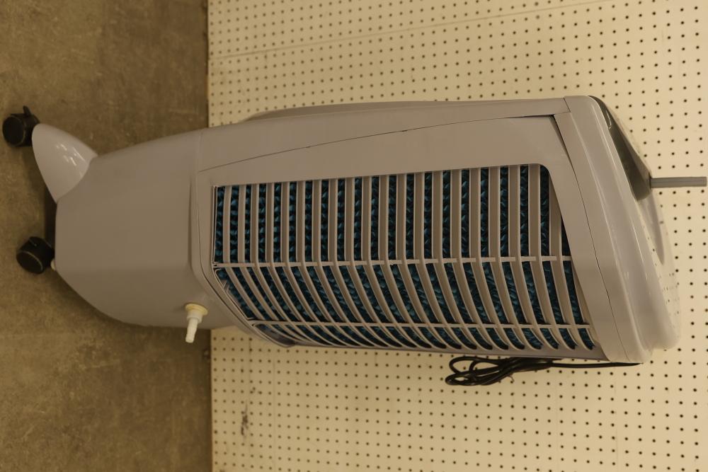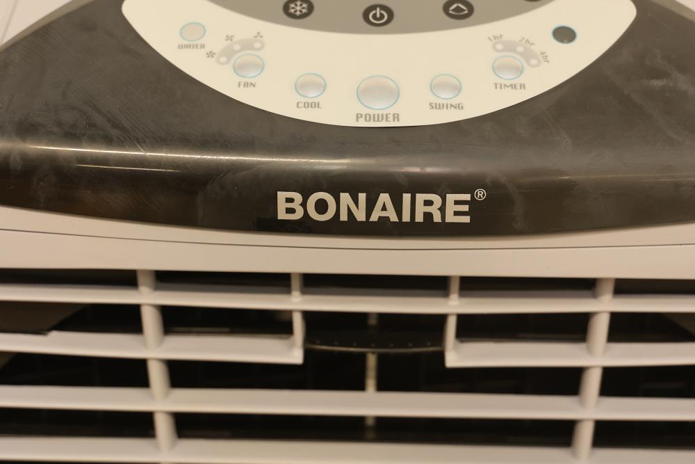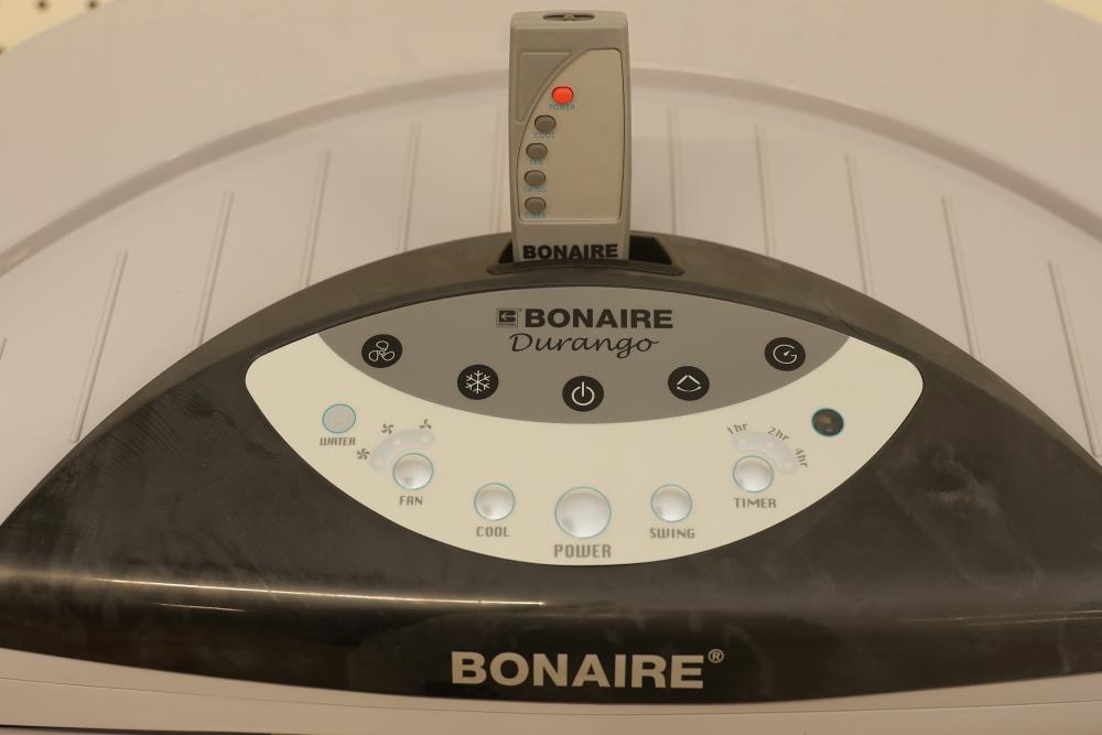 Bonaire Durango 3100 CFM Portable Evaporative Air Cooler with Remote, Model CDU6280051. Features an adjustable control panel, remote control, and removable filters. Requires 120 V, 60 Hz, 1.9A power supply. Instruction manual is not included. Pickup only.