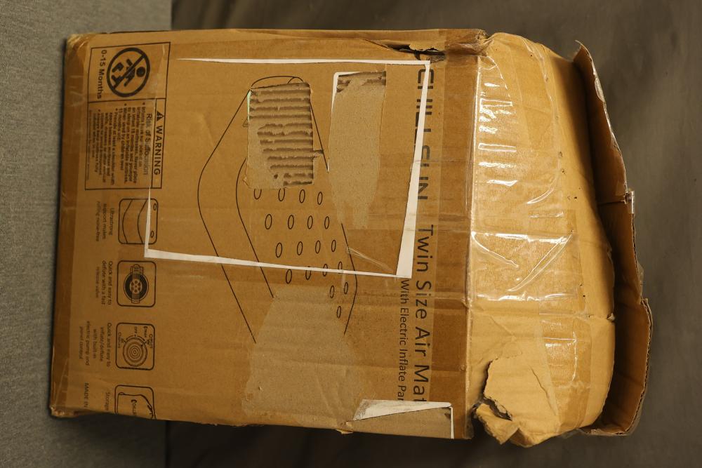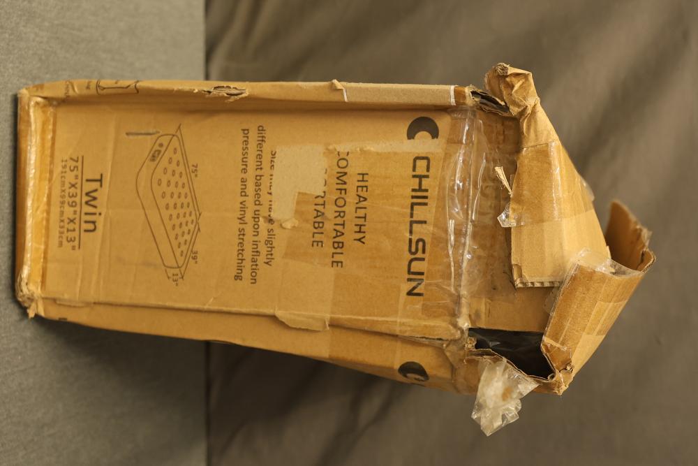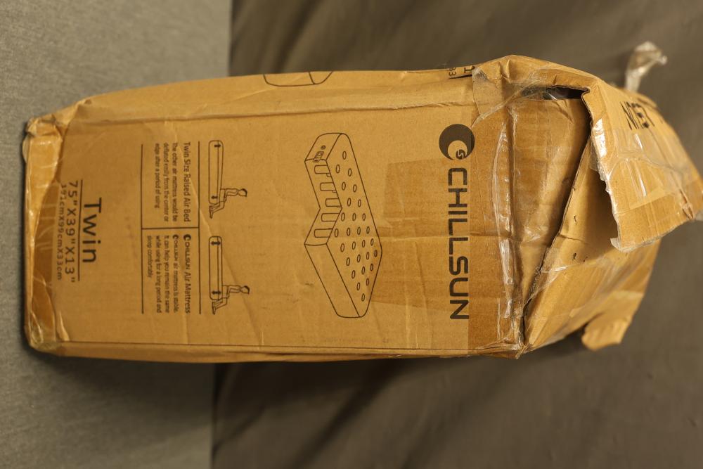 Chillsun Twin Size Air Mattress in Purple, featuring dimensions of approximately 75 inches long, 39 inches wide, and 13 inches deep. Includes an electric inflate panel control for convenient setup. The item remains in its original packaging, though the box shows visible wear.