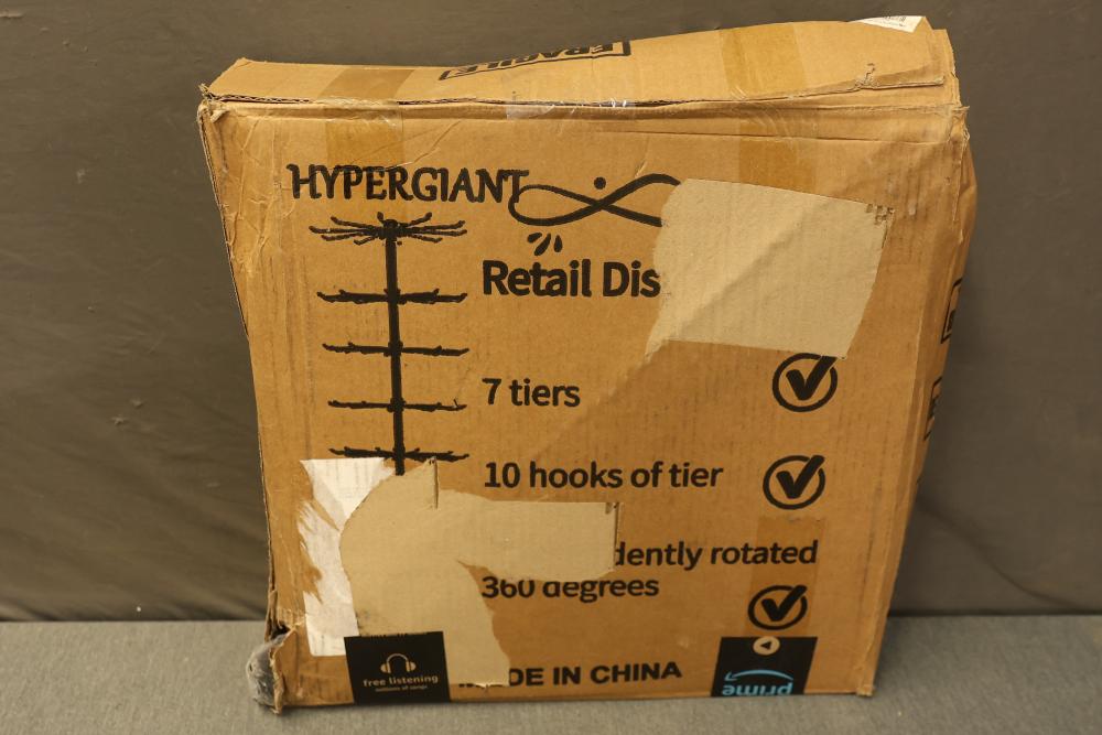 Hypergiant Rotating 7-Tier Retail Display Stand With 10 Hooks Per Tier. Designed with 7 individual rotating tiers, each featuring 10 hooks, for a total of 70 hooks. Ideal for organized and efficient display purposes. Comes packaged in its original box.