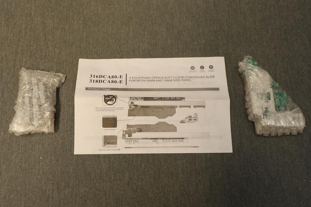 SIGOEI 316DCA80-E 3-Fold Push-Open and Soft Close Bottom Mount Concealed Slide for 16mm and 18mm Panel. Strictly fits side boards less than or equal to 5/8ths of an inch thick and will not lock on 3/4s of an inch thick sides. Includes original packaging and instructions.