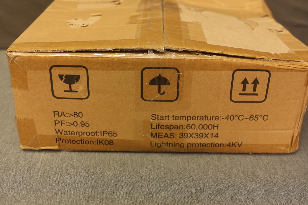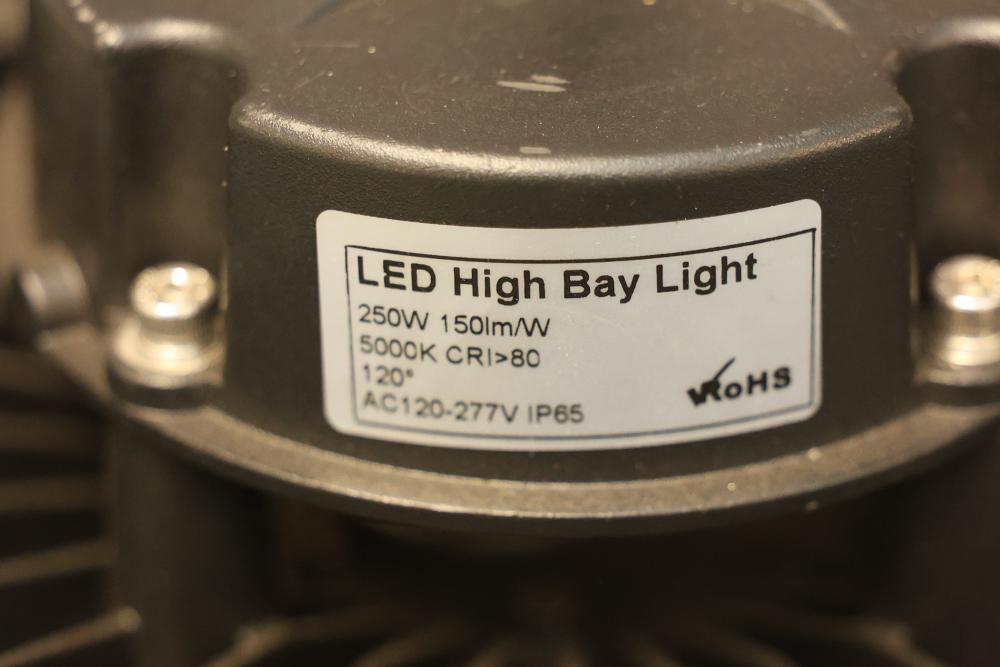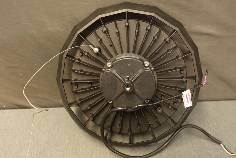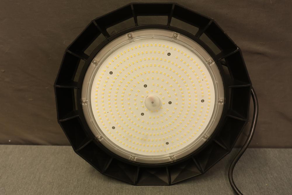 UFO LED High Bay Light Fixture, 240W, with 5000K color temperature. Includes a dimmable feature (0-10V) and IP65 waterproof rating. Light is designed for an input of 100-277VAC with over 60,000 hours of lifespan. The hook and A/C wall plug are missing. Pickup only.