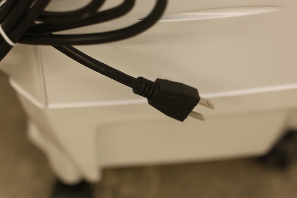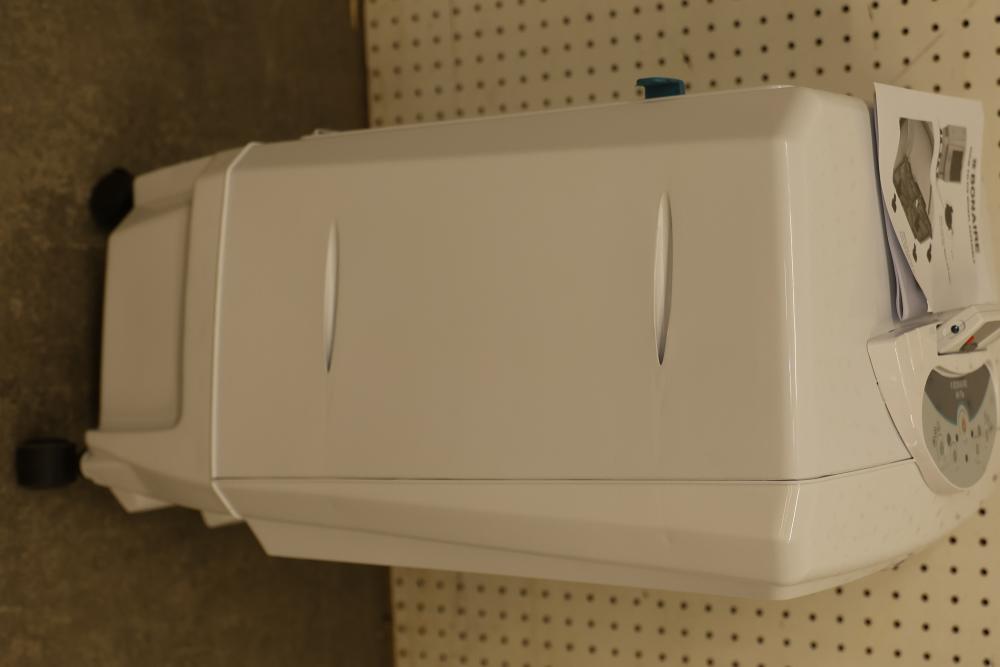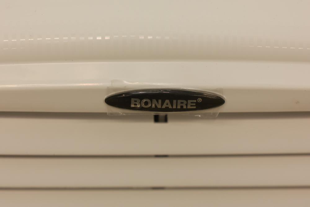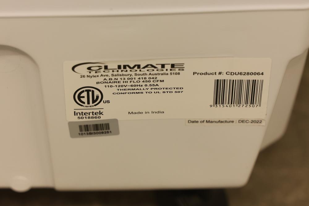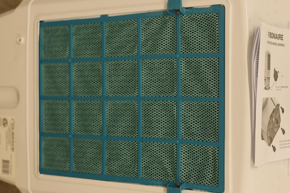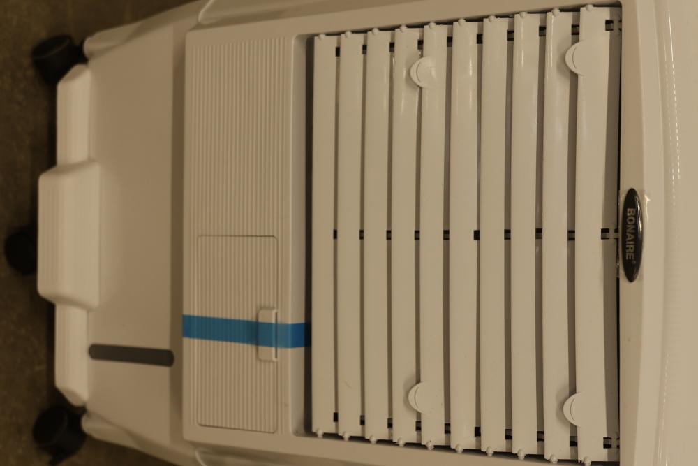 Bonaire Hi Flo 450 CFM Portable Evaporative Air Cooler, Model CDU6280064. Features an adjustable control panel, a remote control, and a removable filter. Includes instruction manual. Specifications: 110-120 V, 60Hz, 0.55A. Pickup only.