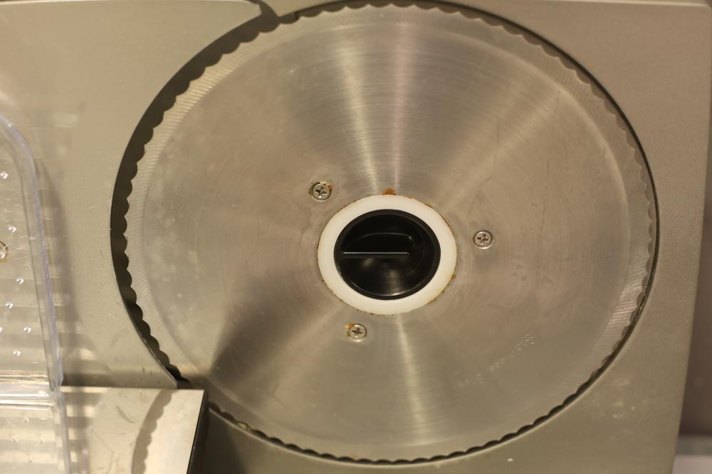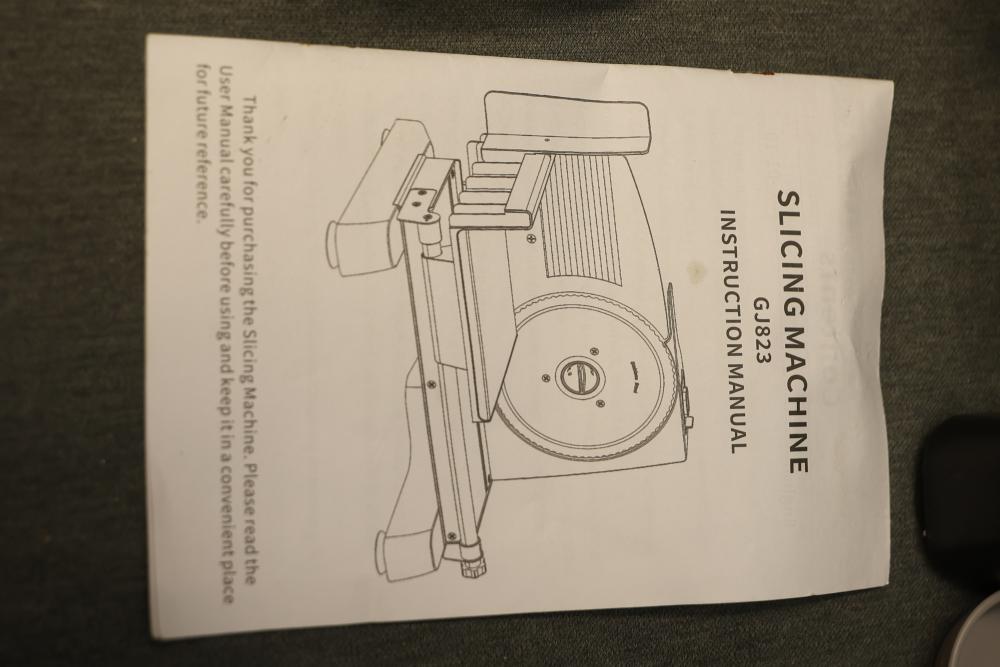 Bieama GJ823 Electric Deli and Meat Slicer with Adjustable Thickness. Includes 2 removable 7.5-inch stainless steel blades and instruction manual. Food plate is cracked, and the item shows signs of previous use. Original packaging is present but shows wear and damage.