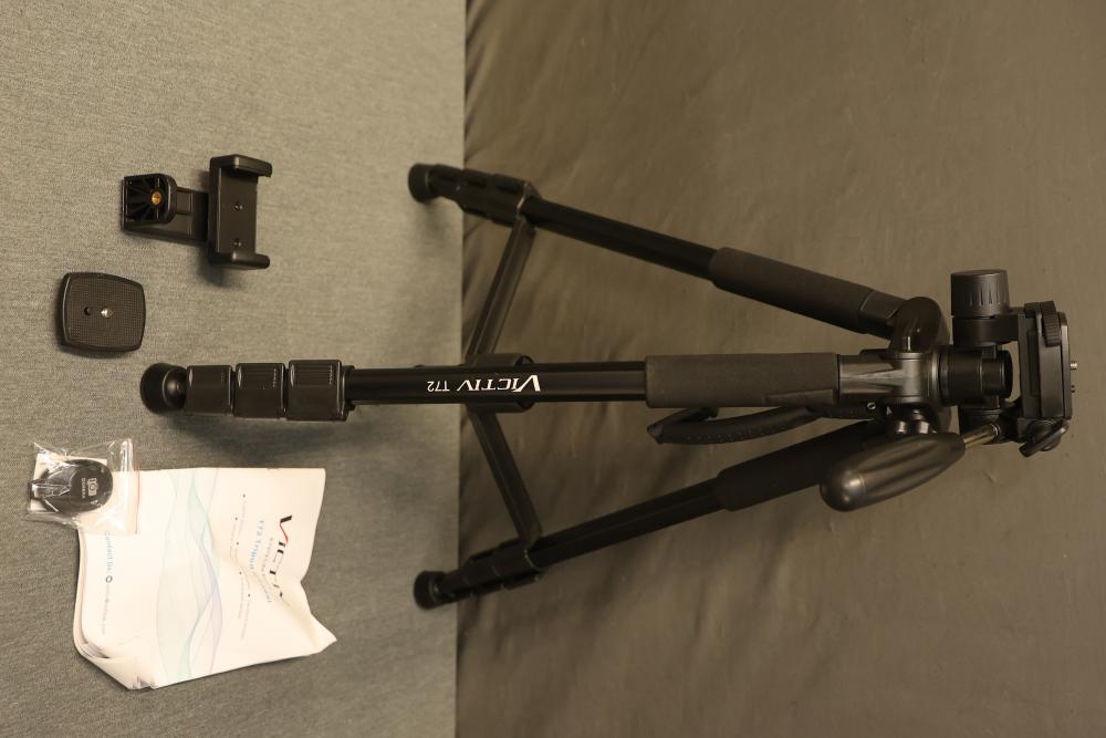 Victiv NT72 and T72 72 Inch Portable Tripods with Accessories. The NT72 tripod includes one remote, one phone holder, and one quick release plate. The T72 tripod includes one remote, one phone holder, and two quick release plates. Both come with carrying bags for transportation and storage.