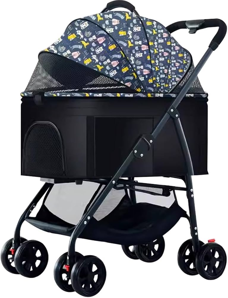 FGQuelle 2-In-1 Foldable Detachable Cat Stroller with Blue Cat Pattern. Supports up to approximately 44 pounds. Features a foldable design for easy storage and a detachable carrier for versatile use. Includes a mesh canopy and spacious storage underneath. Pickup only.