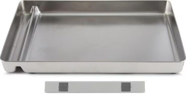 JOYRange Reusable Stainless Steel Cat Litter Tray and SunGrow Durable Metal Scoop in Gray. Litter tray measures approximately 22 inches long and 14.5 inches wide. Litter scoop features a small crack at the end of the scoop.