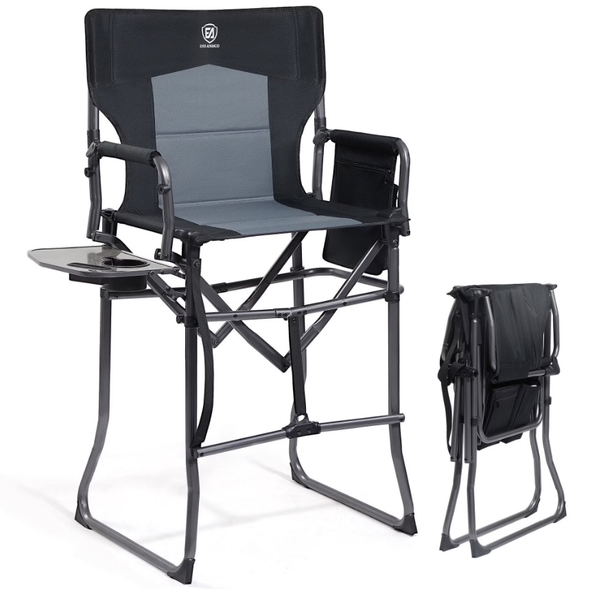 Ever Advanced Portable Folding Directors Chair with Foldable Bar Stool Side Table and Phone Slot. Measures approximately 47 inches high and has a seat width of approximately 21 inches. Supports up to 350 lbs. Comes in Black Gray. Pickup only.