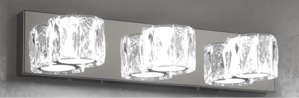 Aipsun 8271-3T 3-Light Crystal Vanity featuring a sleek design with three crystal light fixtures. Measures approximately 20.5 inches long and 4.5 inches wide. Maximum 18W, 6000K color temperature, and supports 100-265V/50-60Hz. Includes installation accessories and gloves.