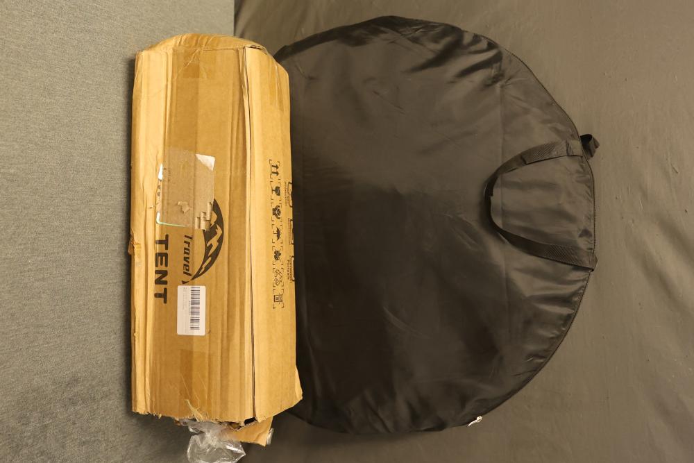 Happy Travel Bike Tent and Wakeman Portable Pop Up Changing Pod. Includes a bike storage tent suitable for accommodating multiple bicycles and a portable changing pod with a carry bag. The changing pod features a quick pop-up design for convenience. Condition appears unused, with original packaging showing minor wear.