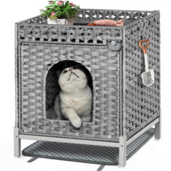 Kureeise Enclosed Cat Litter Box in Gray. Modern woven design with enclosed structure for privacy. Includes metal frame, bottom grid mat, and all necessary assembly hardware. The litter tray scoop referenced in the stock image is not included.
