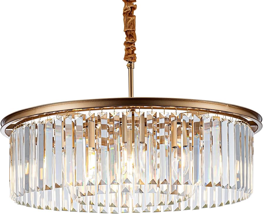 Faibra 23 Inch 8-Light Gold Crystal Pendant Chandelier. The chandelier features a gold finish with crystal accents and an eight-light design. Packaged securely for transportation, the item includes all components necessary for assembly as shown in the packaging. Pickup only.
