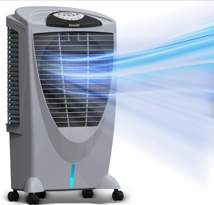Bonaire Durango 3100 CFM Portable Evaporative Air Cooler with Remote, Model CDU6280051. Features an adjustable control panel, remote control, and removable filters. Requires 120 V, 60 Hz, 1.9A power supply. Instruction manual is not included. Pickup only.