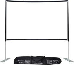 120 Inch Portable Projector Screen with Carrying Case. Includes support frame, projector fabric, and necessary assembly components. Two water bags are missing from the set. The carrying case allows for easy transport and organization.