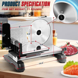 Bieama GJ823 Electric Deli and Meat Slicer with Adjustable Thickness. Includes 2 removable 7.5-inch stainless steel blades and instruction manual. Food plate is cracked, and the item shows signs of previous use. Original packaging is present but shows wear and damage.