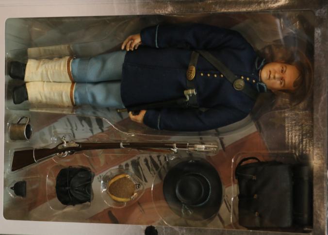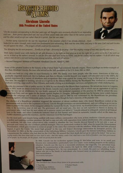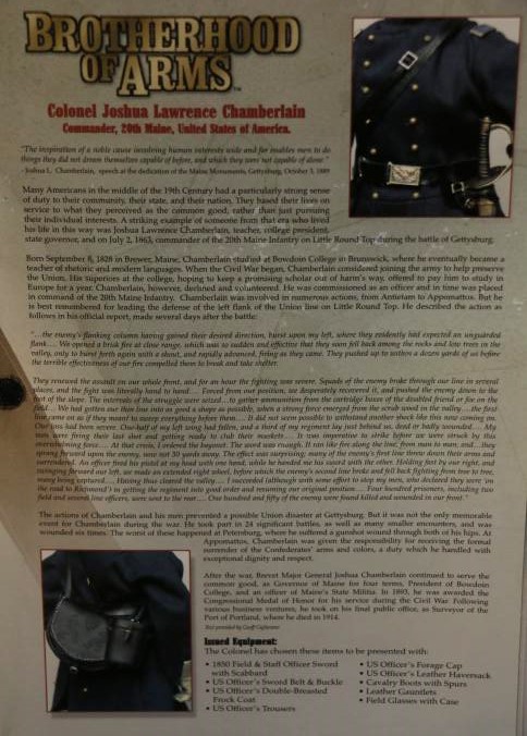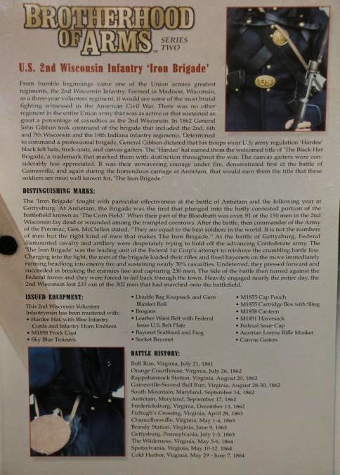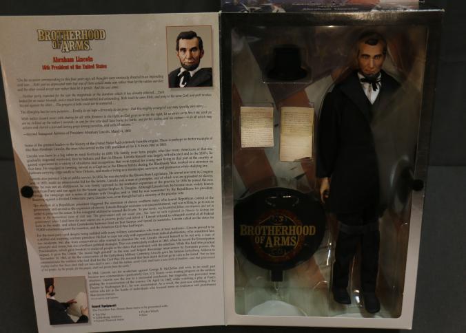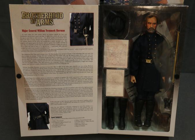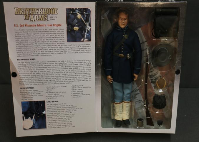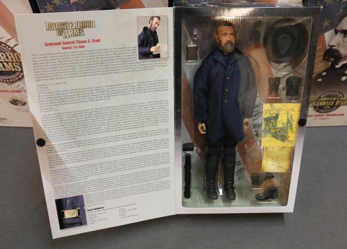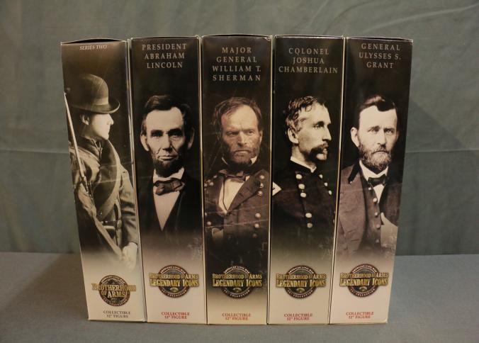 Five Brotherhood of Arms action figures depicting Union Generals and Infantryman. Includes boxed action figures: General Joshua Lawrence Chamberlain, General William T. Sherman, President Abraham Lincoln, a soldier from the 2nd Wisconsin Volunteer Infantry Iron Brigade, and General Ulysses S. Grant. Each figure is accompanied by themed accessories, attire, and historical documentation.