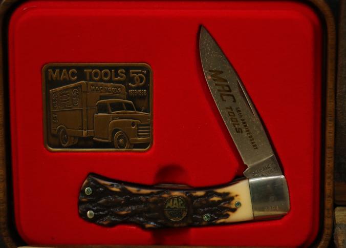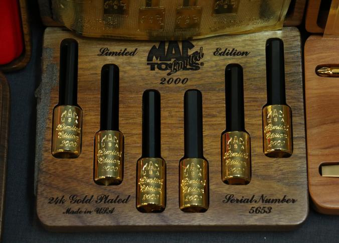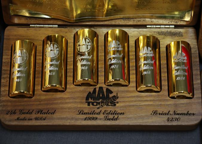 Mac Tools 24K Gold-Plated Limited Edition Gift Sets in Wooden Display Cases. Features include socket sets and screwdrivers with 24K gold-plated components, accompanied by two commemorative pocket knives with etched blades and plaques.