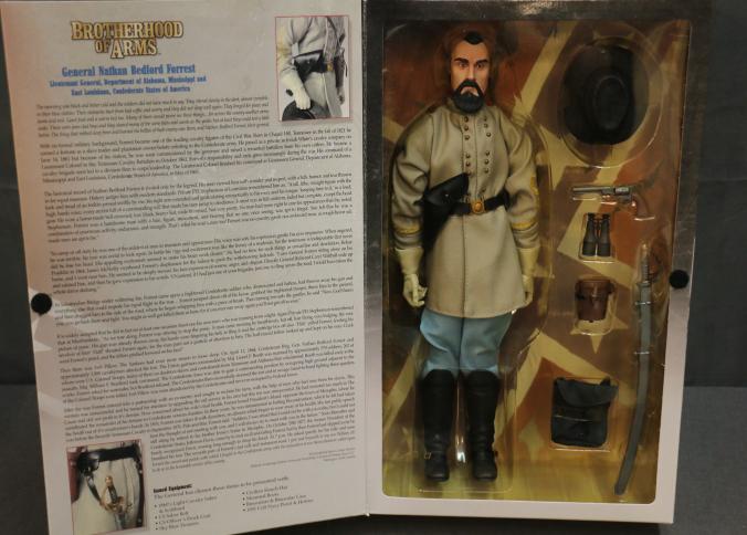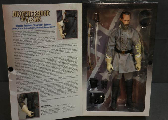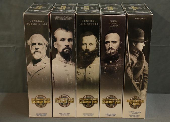 Five Brotherhood of Arms action figures depicting Confederate generals and infantryman, including Robert E. Lee, Nathan Bedford Forrest, J.E.B. Stuart, Thomas Jonathan 'Stonewall' Jackson, and a Confederate Infantryman. Figures come with detailed period-specific uniforms, weapons, and accessories.