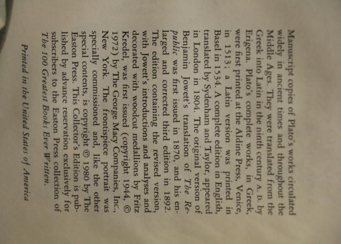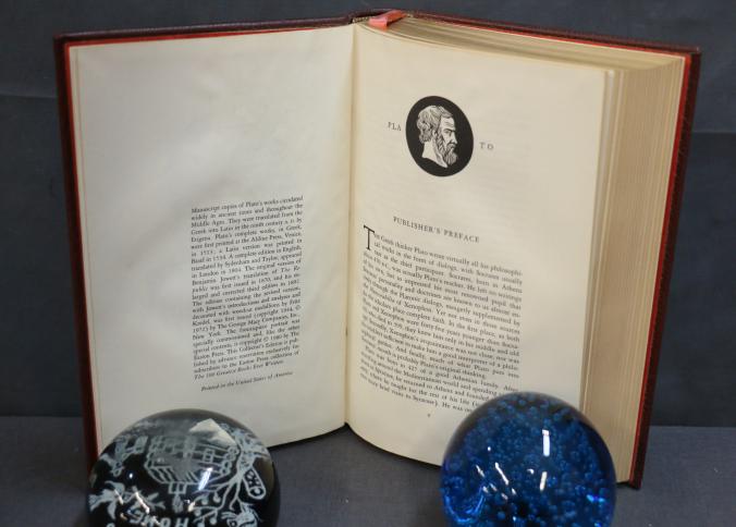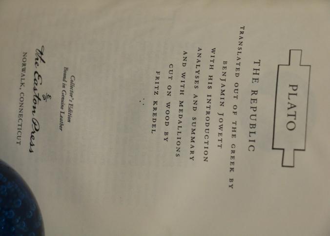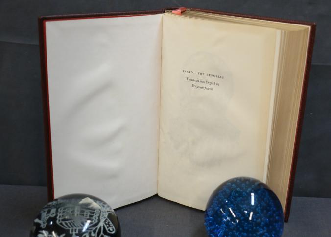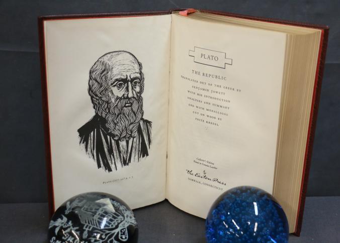 The Republic' Leatherbound Edition by Plato, featuring a leather cover with intricate gold-tone embossed designs on the spine and covers. Includes illustrations, gold leaf page edges, and a built-in red ribbon bookmark. Published by The Easton Press and copyrighted 1970 with translated text by Benjamin Jowett.