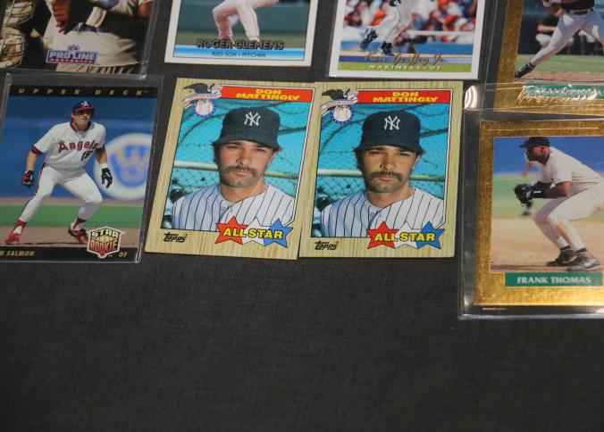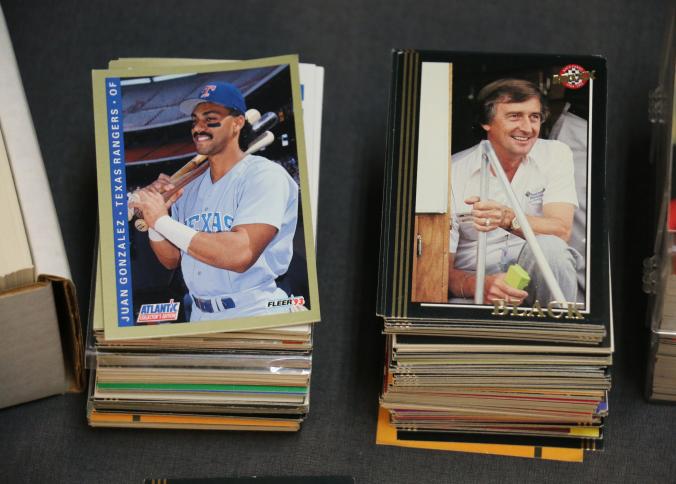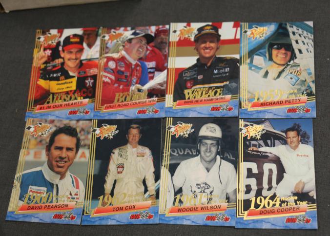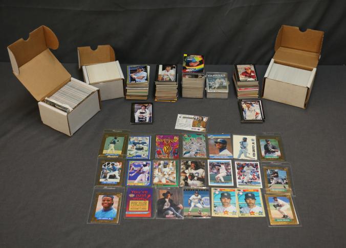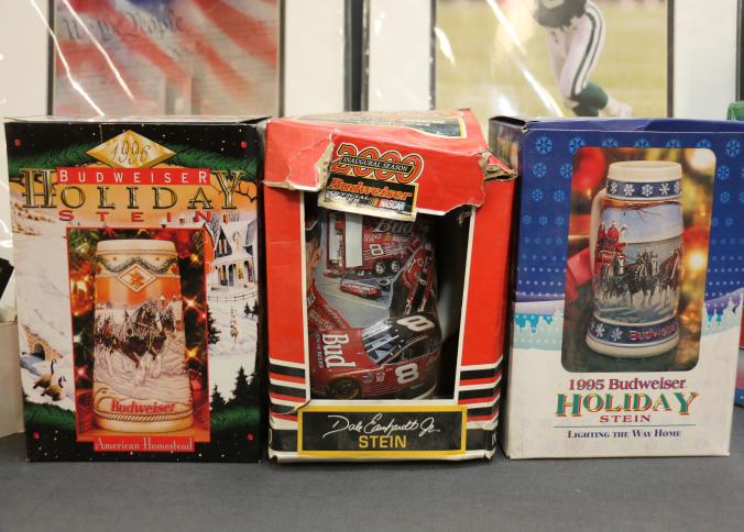 Autographed Dallas Cowboys Cheerleaders Photo with Sports trading cards and collectibles including baseball cards such as Ken Griffey Jr., Don Mattingly, and Frank Thomas, football cards featuring Michael Irvin, and NASCAR trading cards. Includes unopened card boxes, framed items, a 1994-1995 Dallas Cowboys Cheerleaders signed photograph, and branded collectible items like Budweiser holiday steins.
