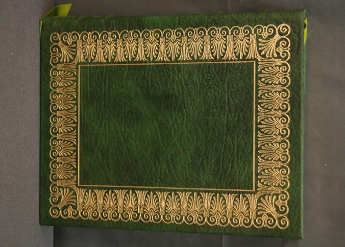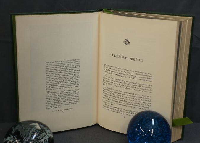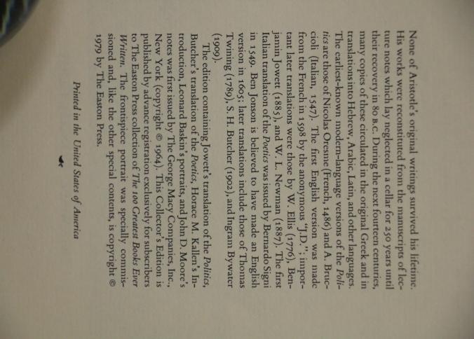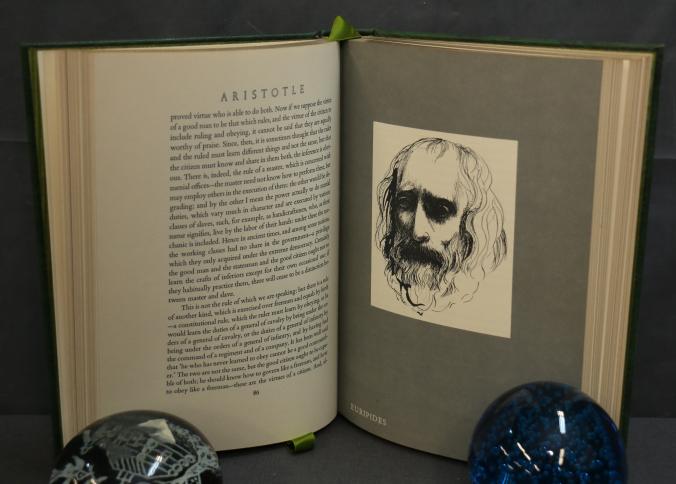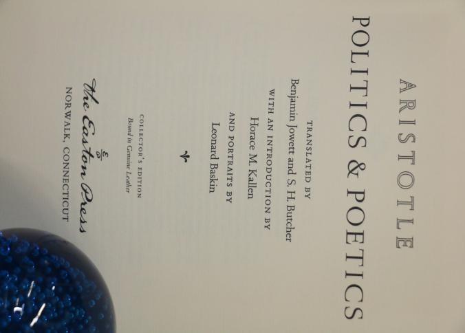 Politics & Poetics' by Aristotle, Translated by Jowett and Butcher. Bound in genuine leather with intricate gold leaf decoration on the covers and spine. Features gold leaf-edged pages, a ribbon bookmark, and illustrations by Leonard Baskin. Copyright 1979 by The Easton Press.