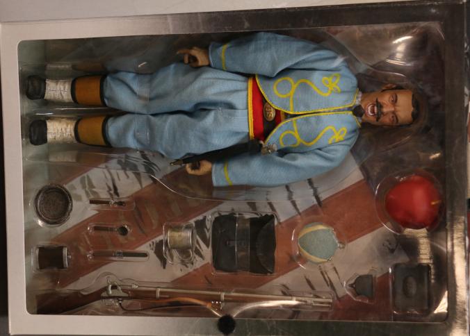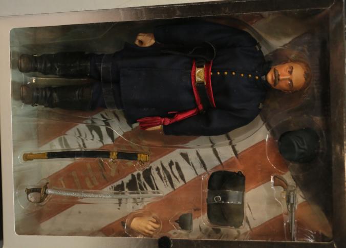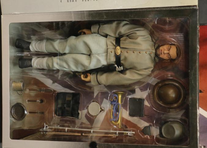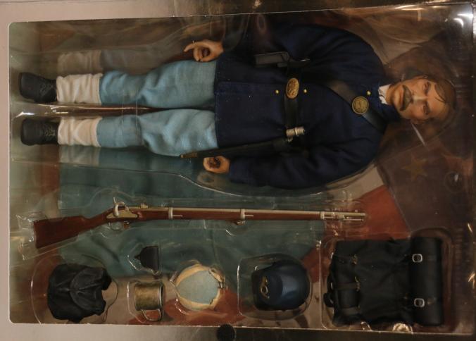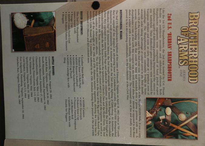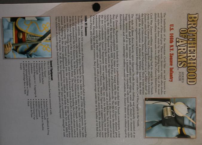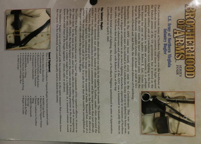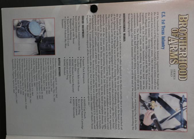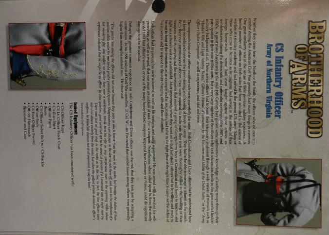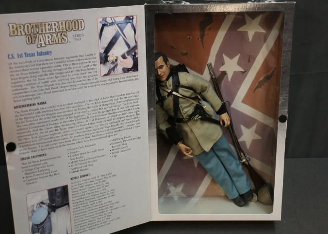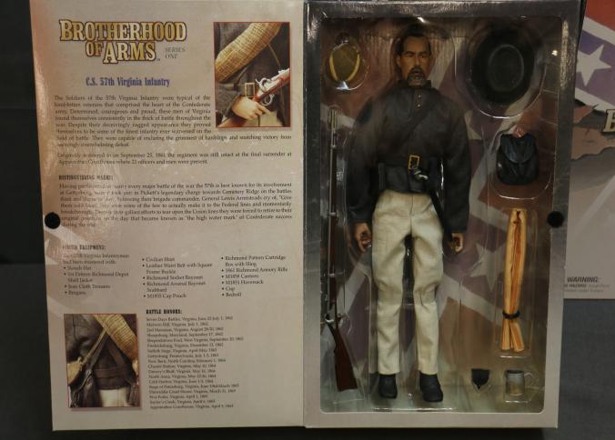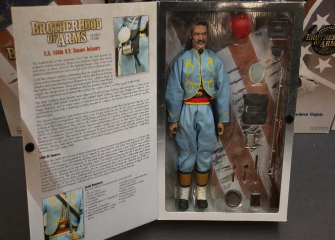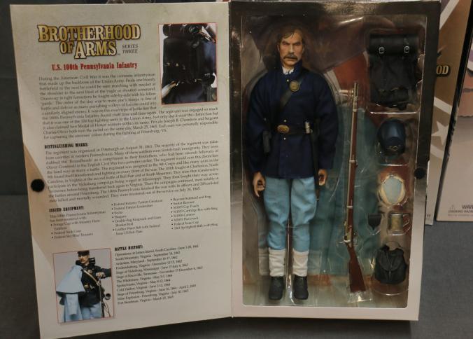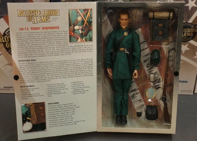 Brotherhood of Arms U.S. and C.S. military figures set featuring multiple figures, each with detailed uniforms, issued equipment, and accessories. Figures include sharpshooters, infantry officers, and specialized units. Each box includes historical background and battle honors of the depicted units.