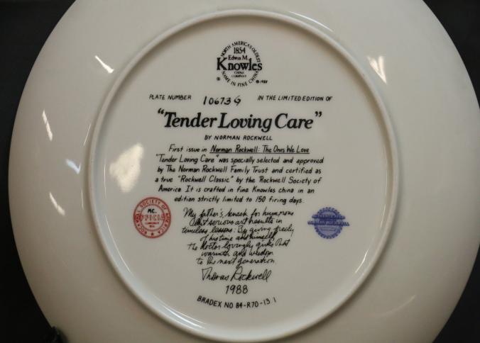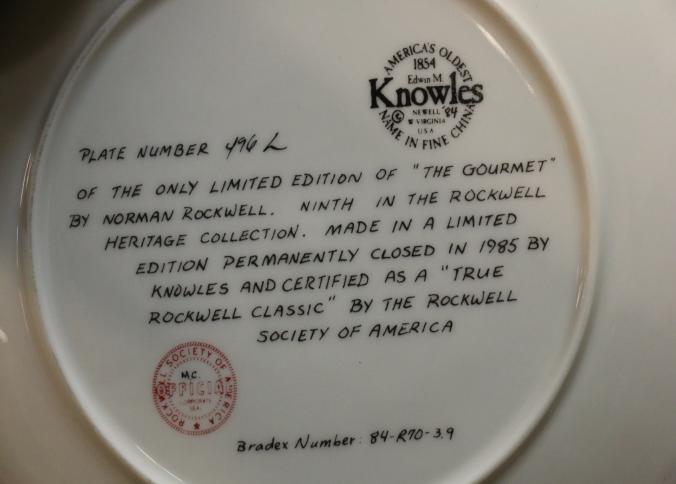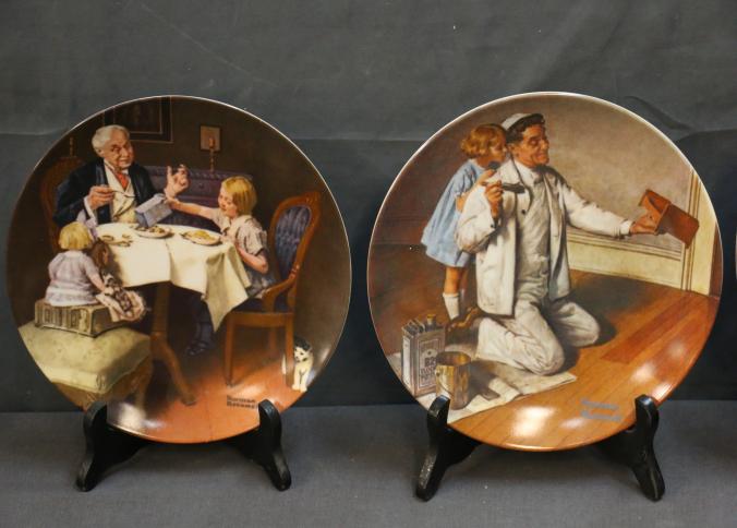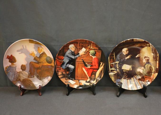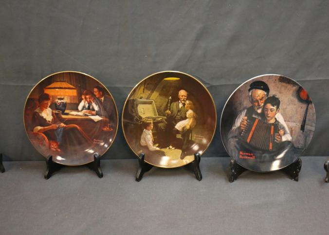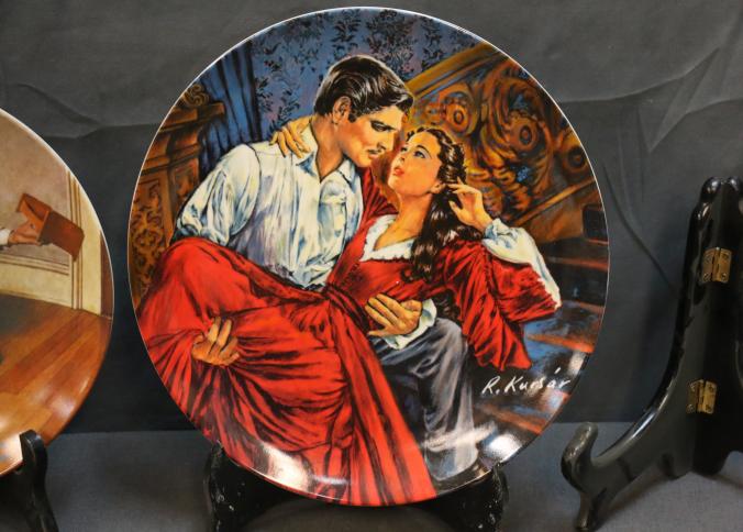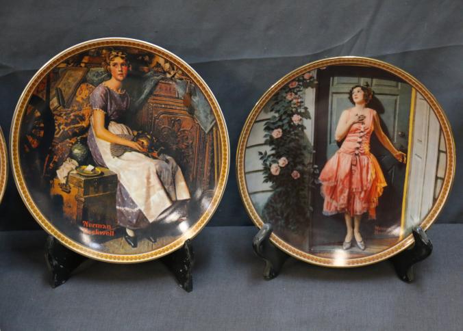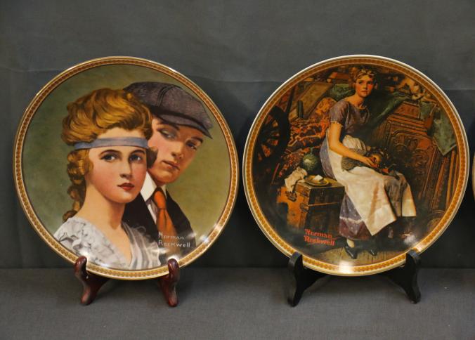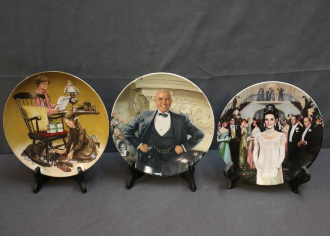 Norman Rockwell and Edwin M. Knowles Limited Edition Plates featuring artwork such as 'Scarlett and Rhett,' 'The Gourmet,' 'Awakening,' and others. Some pieces have decorative gold-tone trims. Includes a variety of illustrated themes. Pickup only.