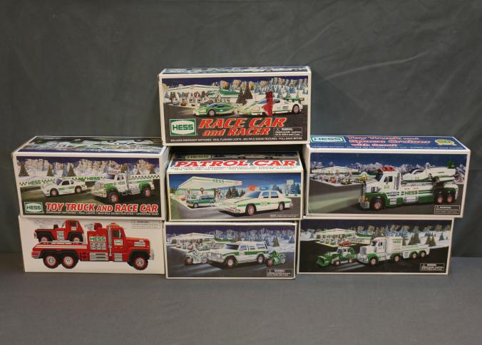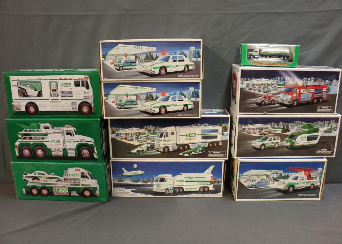 27 Hess Trucks and Vehicles from the years 1990, 1992, 1993, 1994, 1996, 1998, 1999, 2003, 2004, 2005, 2006, 2009, 2010, 2011, 2013, 2014, 2015, 2016, and 2019. Items include race cars, patrol cars, toy trucks, jets, car carriers, fire trucks, spaceships, tankers, and more. Pickup only.