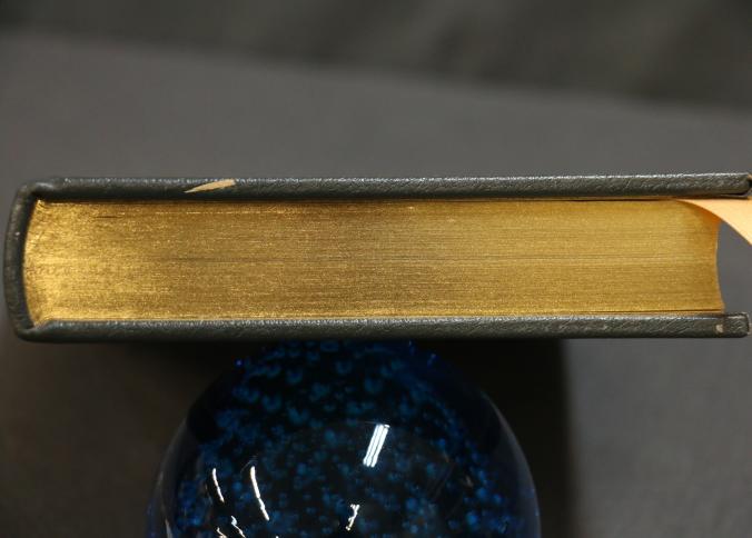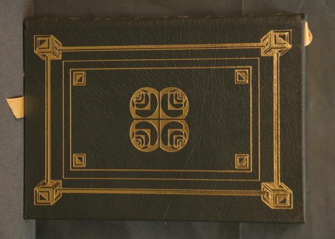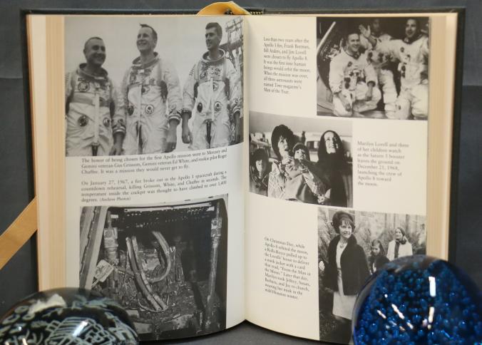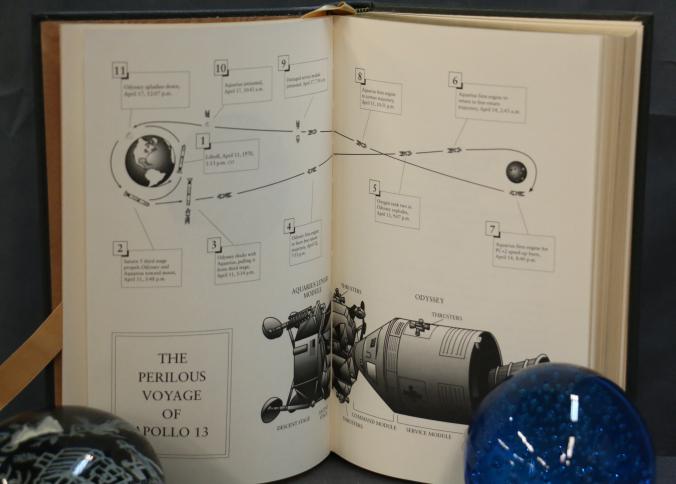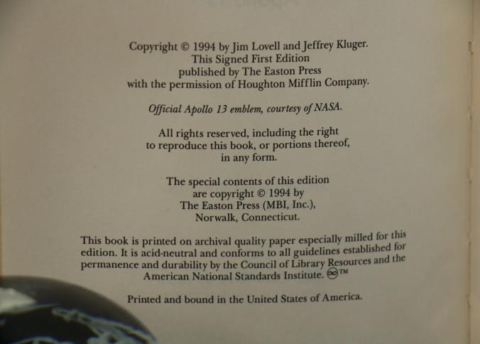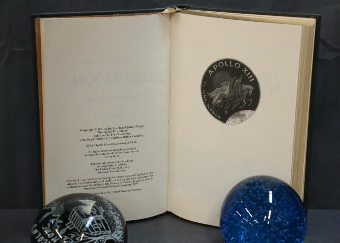 Signed First Edition 'Lost Moon' by Lovell and Kluger. Leather-bound book featuring gold leaf accents, a ribbon marker, and gold leaf page edges. Includes illustrations and the iconic Apollo XIII emblem. Personally signed by James Lovell and Jeffrey Kluger. Published by The Easton Press with permission from Houghton Mifflin Company and copyrighted 1989.