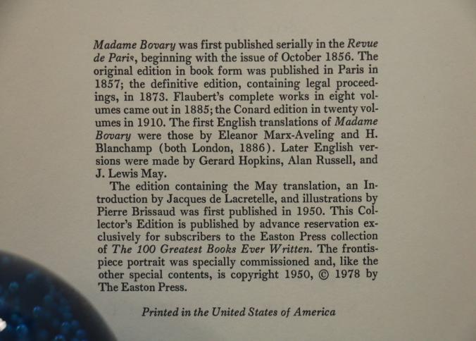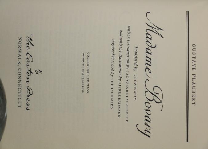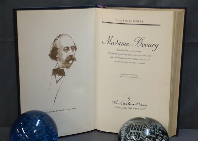 Madame Bovary by Gustave Flaubert, Easton Press Collector's Edition, bound in dark leather with gold leaf decoration and lettering on the cover and spine. Features gold leaf-edged pages, satin ribbon marker, and wood engravings by Theo Schmied. Includes an introduction by Jacques de Lacretelle, translated by J. Lewis May. Copyright 1978 by The Easton Press.