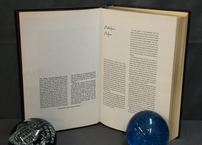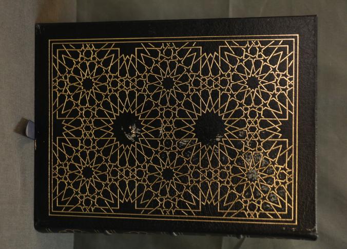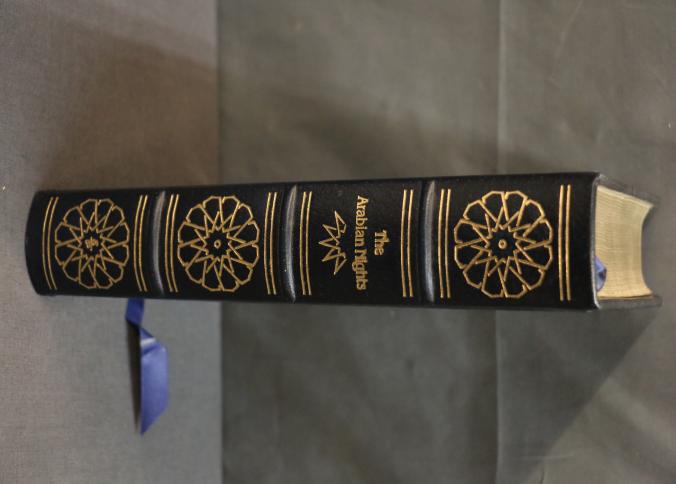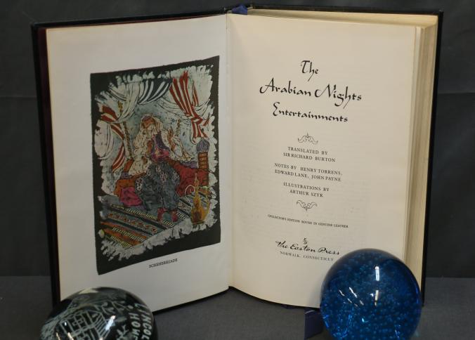The Arabian Nights Entertainments Leather-Bound Easton Press Edition. Translated by Sir Richard Burton with notes by Henry Torrens, Edward Lane, and John Payne and illustrations by Arthur Szyk. This collector's edition is bound in genuine leather with intricate gold-tone embossed designs on the cover and spine. Includes gold leaf page edges and a satin bookmark ribbon. Copyright 1981 by The Easton Press.