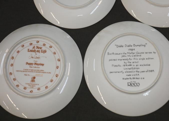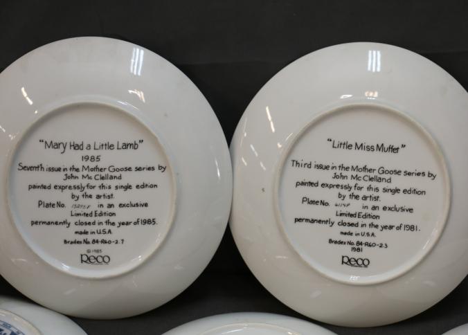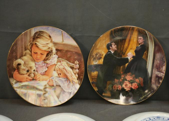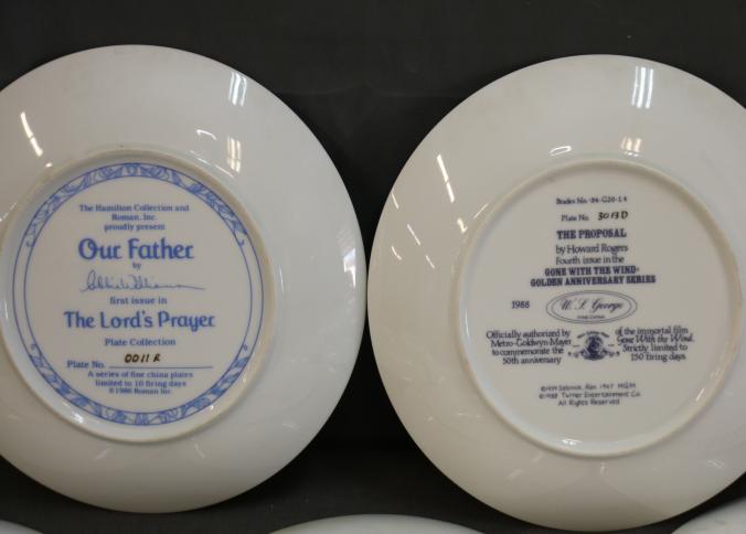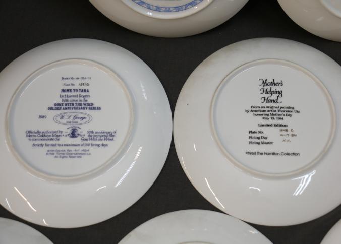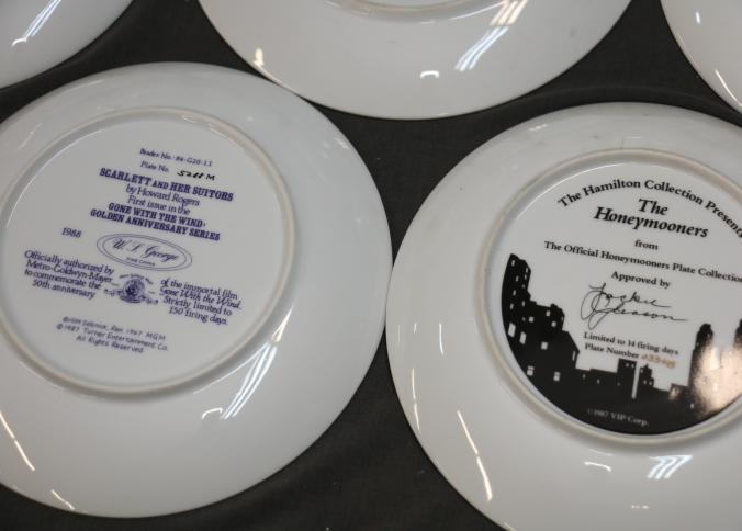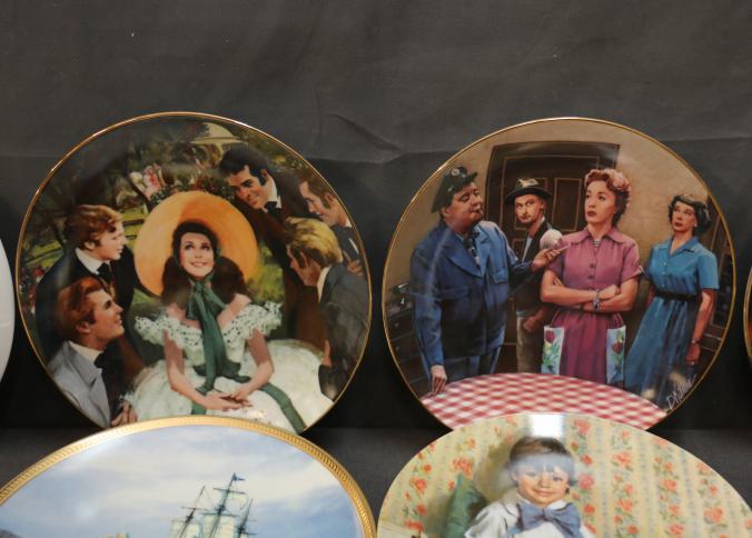14 decorative collector plates featuring various scenes from literature, art, and historical themes. Plates include works from The Hamilton Collection, Reco, and similar makers, with titles such as 'Scarlett and Rhett Butler,' 'The Honeymooners,' 'U.S.S Constitution,' 'Little Bo Peep,' and more. Pickup only.