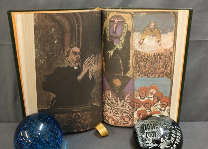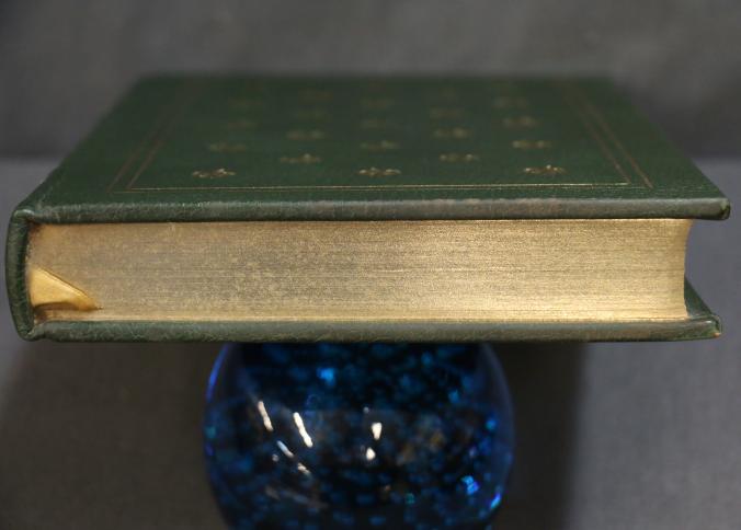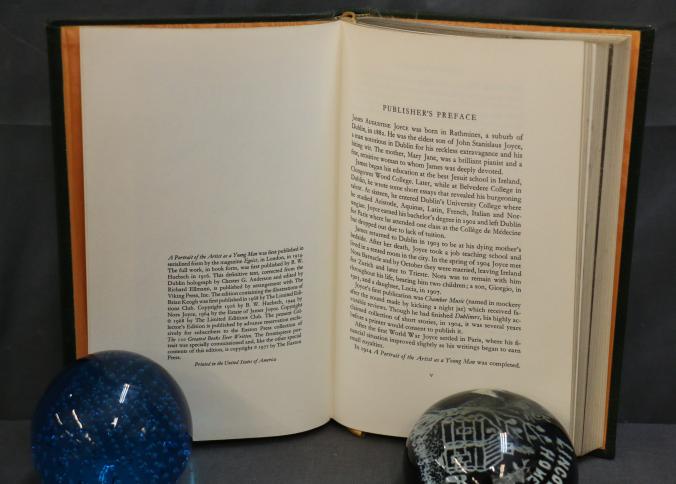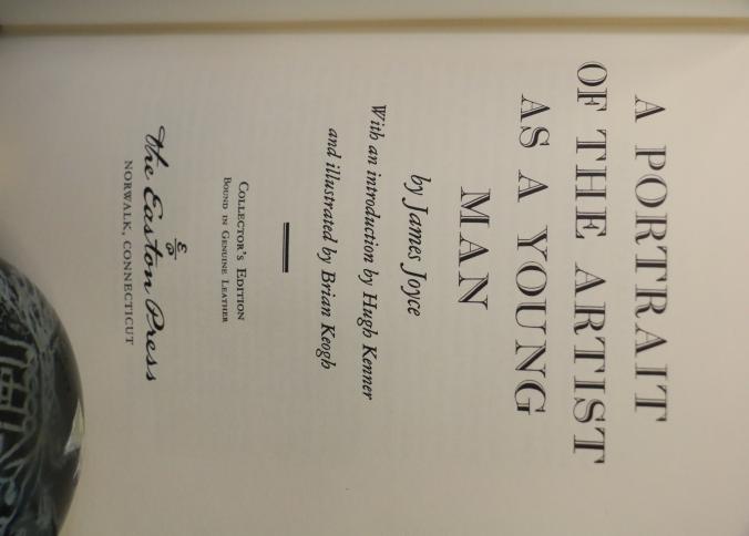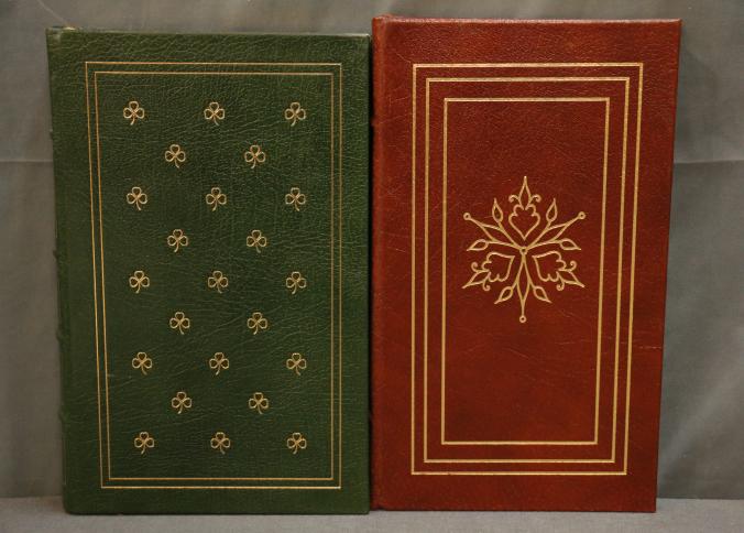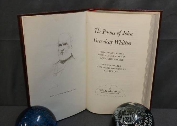 Easton Press leather-bound editions of 'A Portrait of the Artist as a Young Man' by James Joyce, with illustrations by Brian Keogh, and 'The Poems of John Greenleaf Whittier,' selected and edited by Louis Untermeyer with illustrations by R.J. Holden. Both books feature gold leaf decorations, gold leaf edges, and ribbon bookmarks. Copyright 1973 and 1977 by The Easton Press.