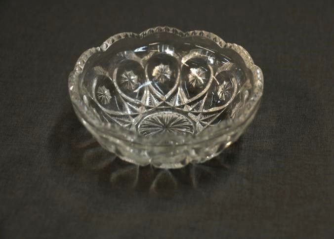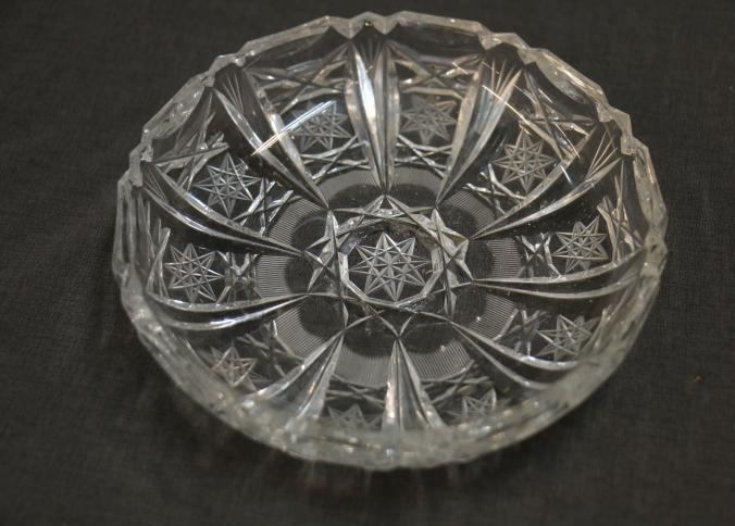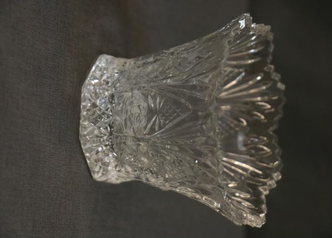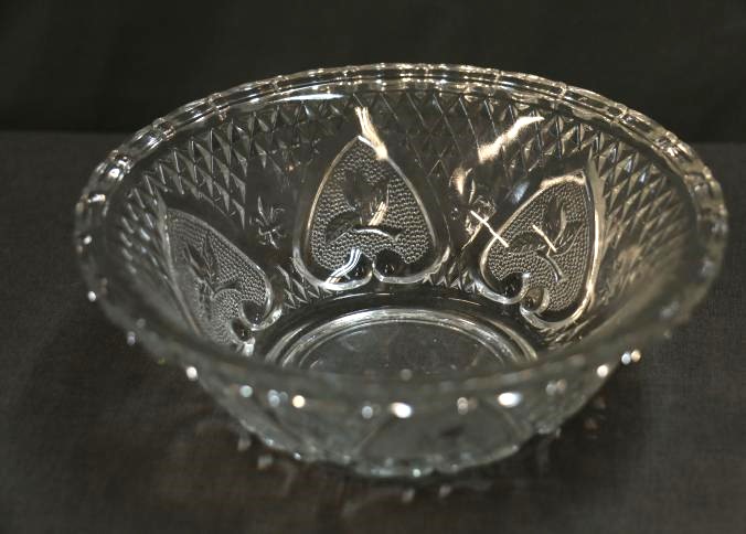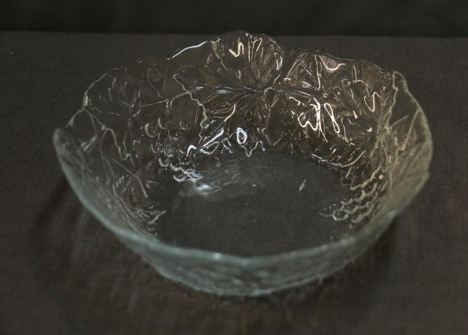 Six Clear Glass Serving and Decorative Bowls. Includes a variety of clear glass designs, including bowls, a footed vessel, and a flared vase with textured and patterned details. Ideal for serving or as decorative pieces. Pickup only.